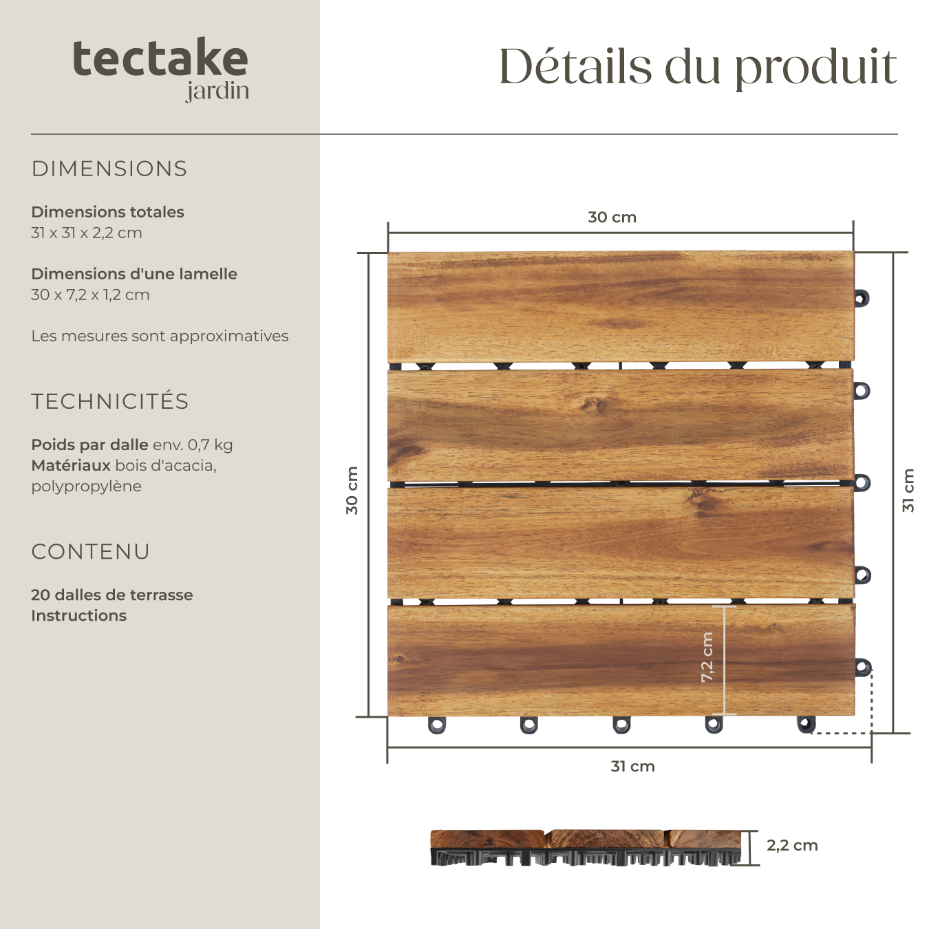 - Dimensions totales (LxlxH) : env. 31 x 31 x 2,2 cm
