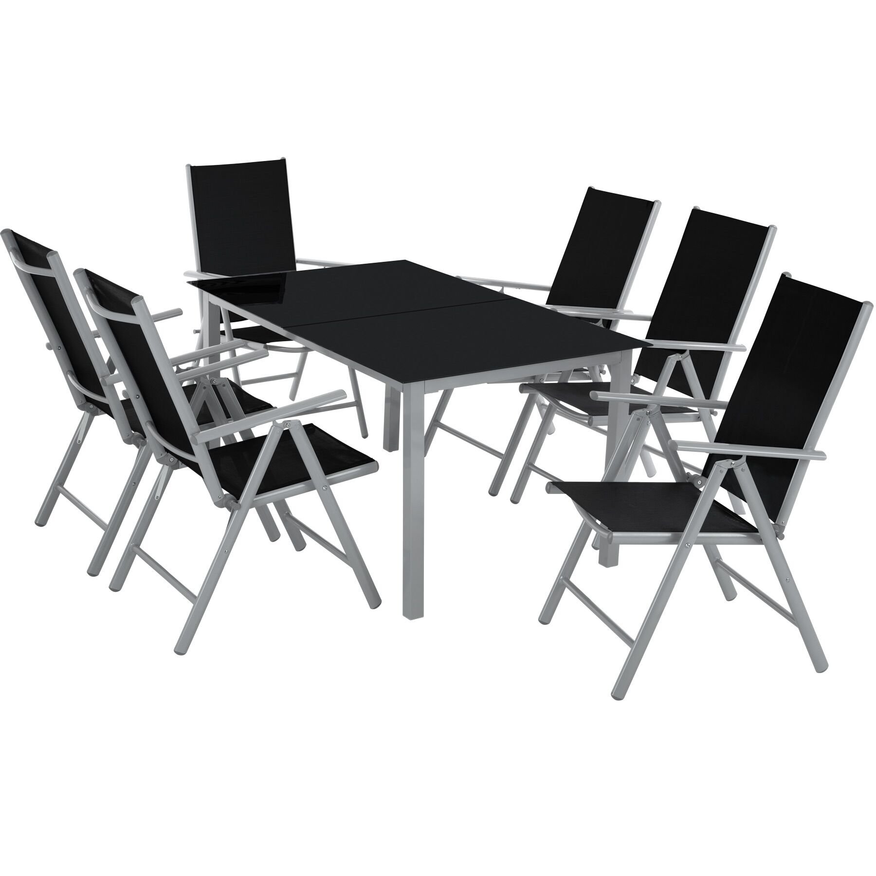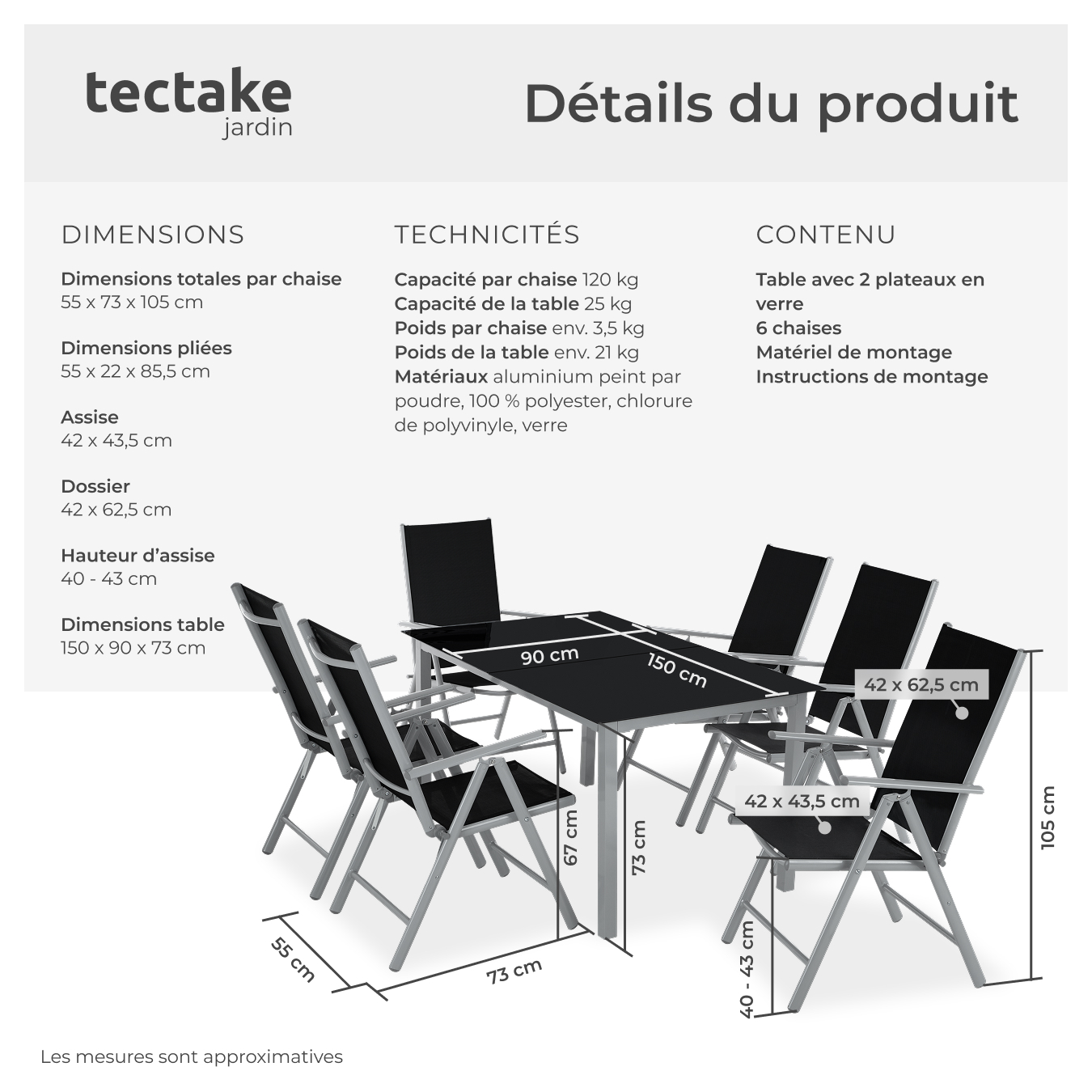 Salon de Jardin avec 6 Chaises Pliantes et 1 Table en Verre et en Aluminium TECTAKE. Le salon de jardin durable en aluminium va vous séduire par son design moderne. Idéal pour passer des moments agréables dans votre jardin, sur votre terrasse ou sur votre balcon. La table de qualité est dotée d'un plateau en verre trempé esthétique et d'un support en aluminium revêtu par poudre. Les 6 chaises sont réalisées en aluminium stable, ce qui les rend légères et donc faciles à déplacer. Elles sont inclinables et possèdent un dossier haut qui vous apporte plus de confort. Les chaises peuvent être pliées et rangées en quelques instants, de manière peu encombrante.
