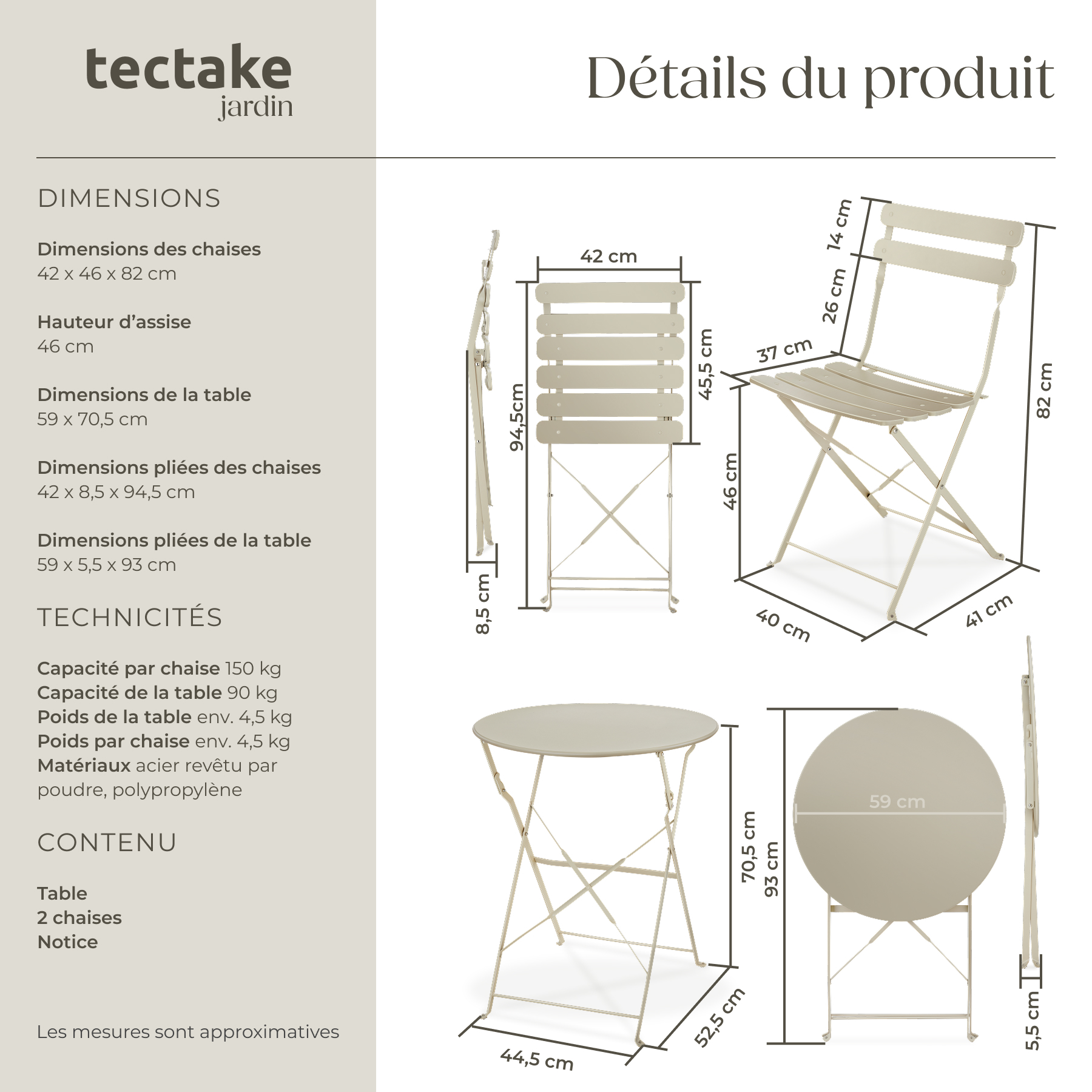 | Libellé | TECTAKE Ensemble table et chaises bistrot pour 2 personnes crème |