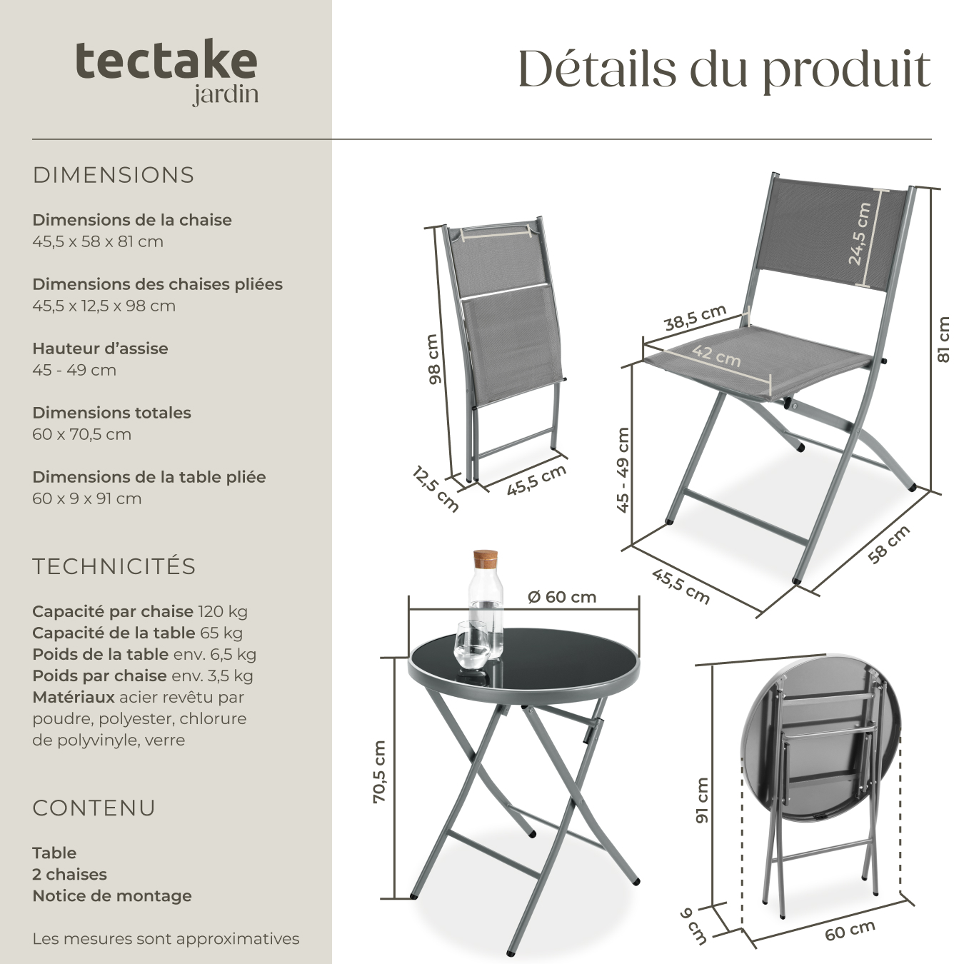 | Libellé | TECTAKE Ensemble table et chaises de jardin bistrot pliable pour 2 personnes gris |