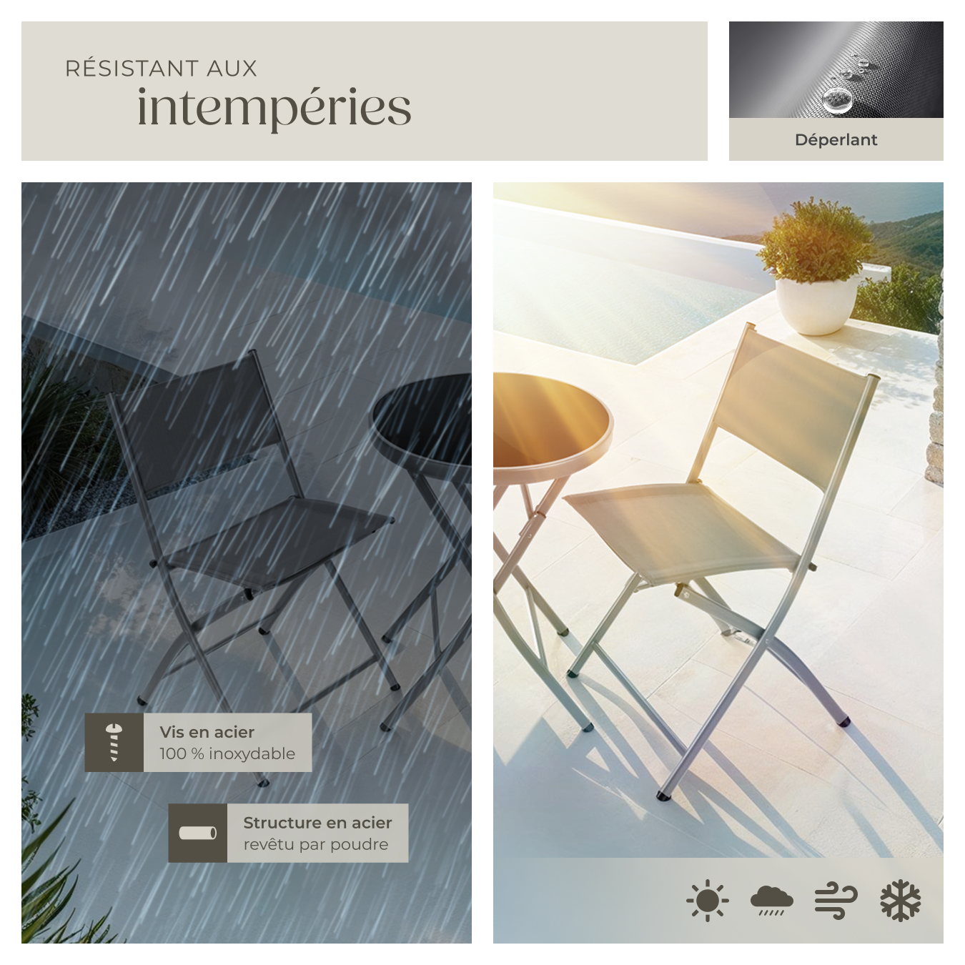 - Matériaux : Acier revêtu par poudre. / Textilène (70 % Polychlorure de vinyle, 30 % Polyester).