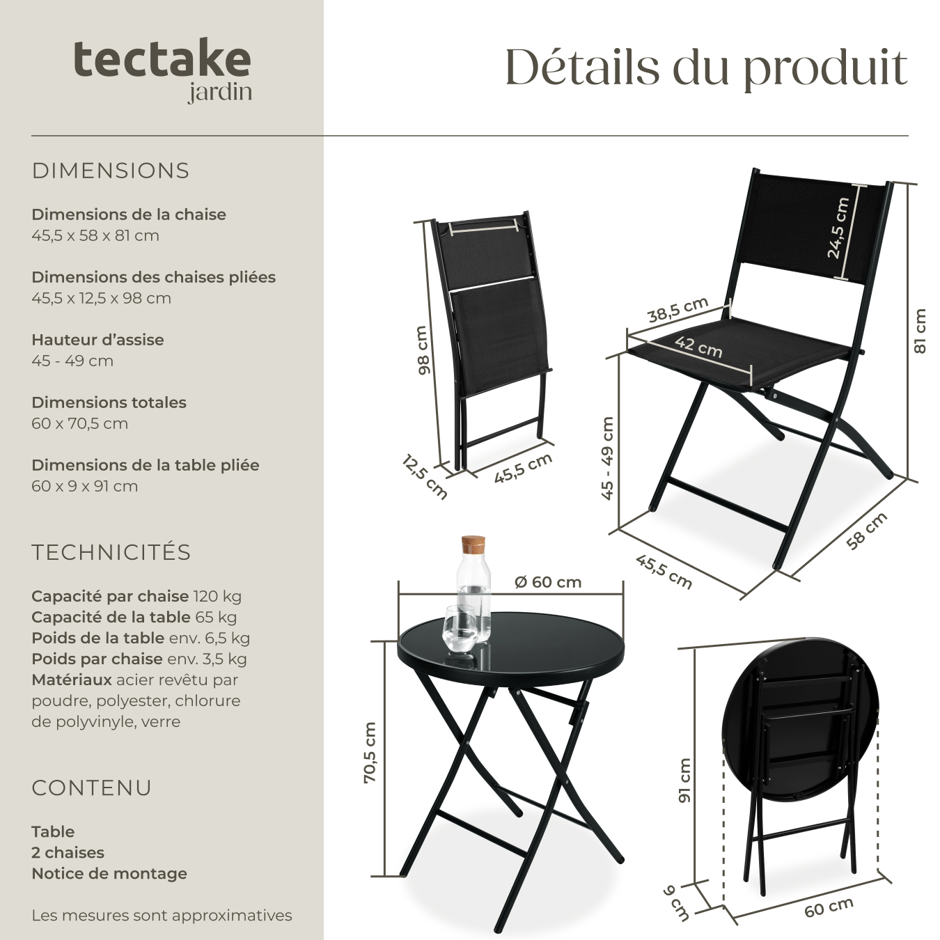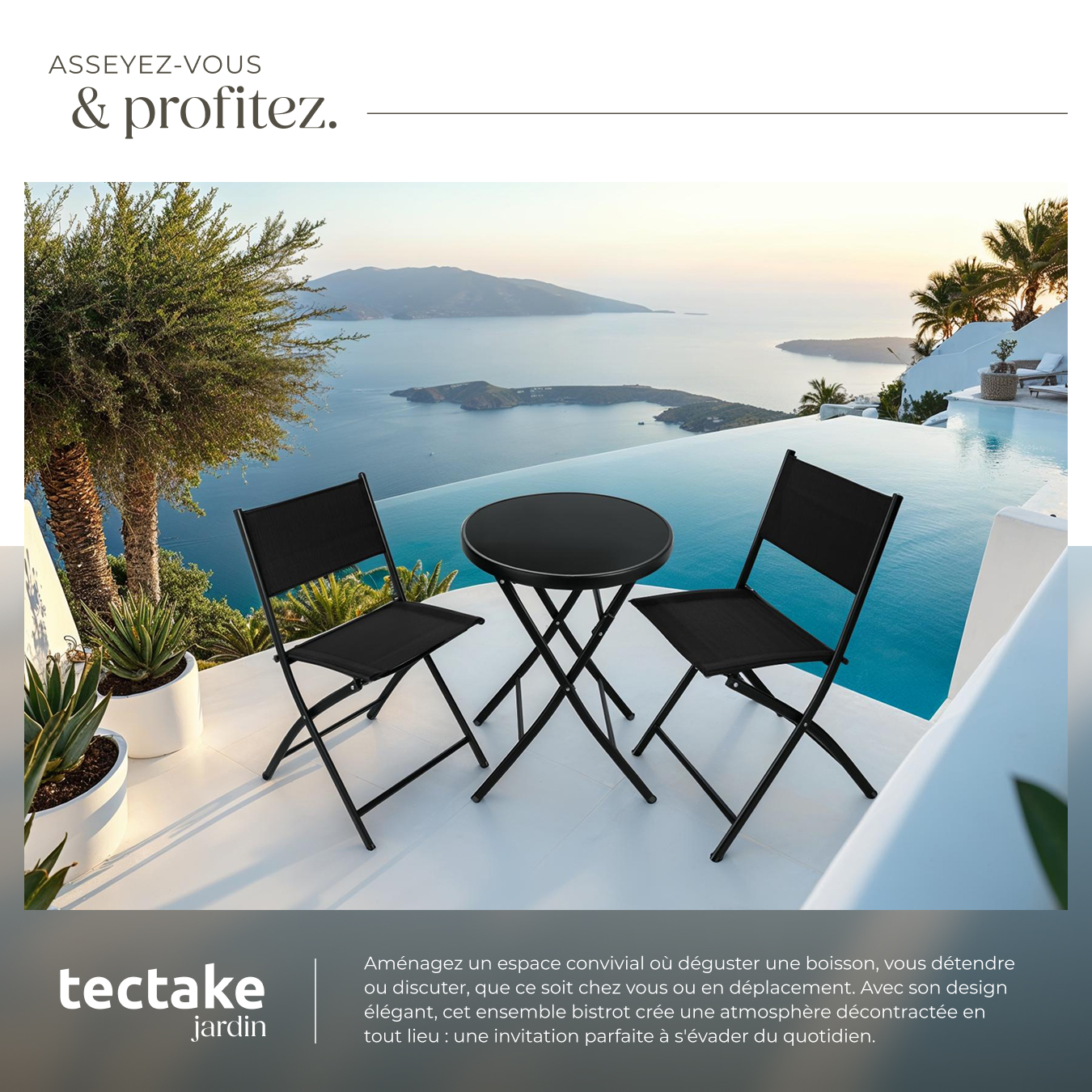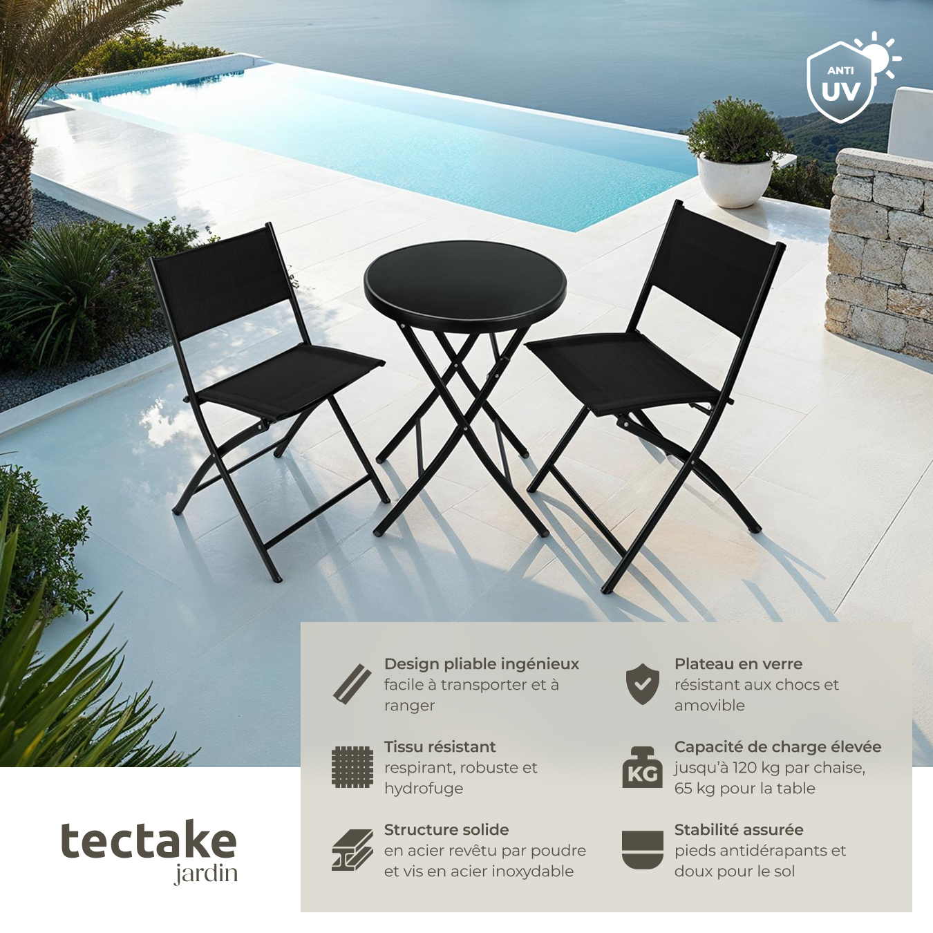 | Libellé | TECTAKE Ensemble table et chaises de jardin bistrot pliable pour 2 personnes noir |