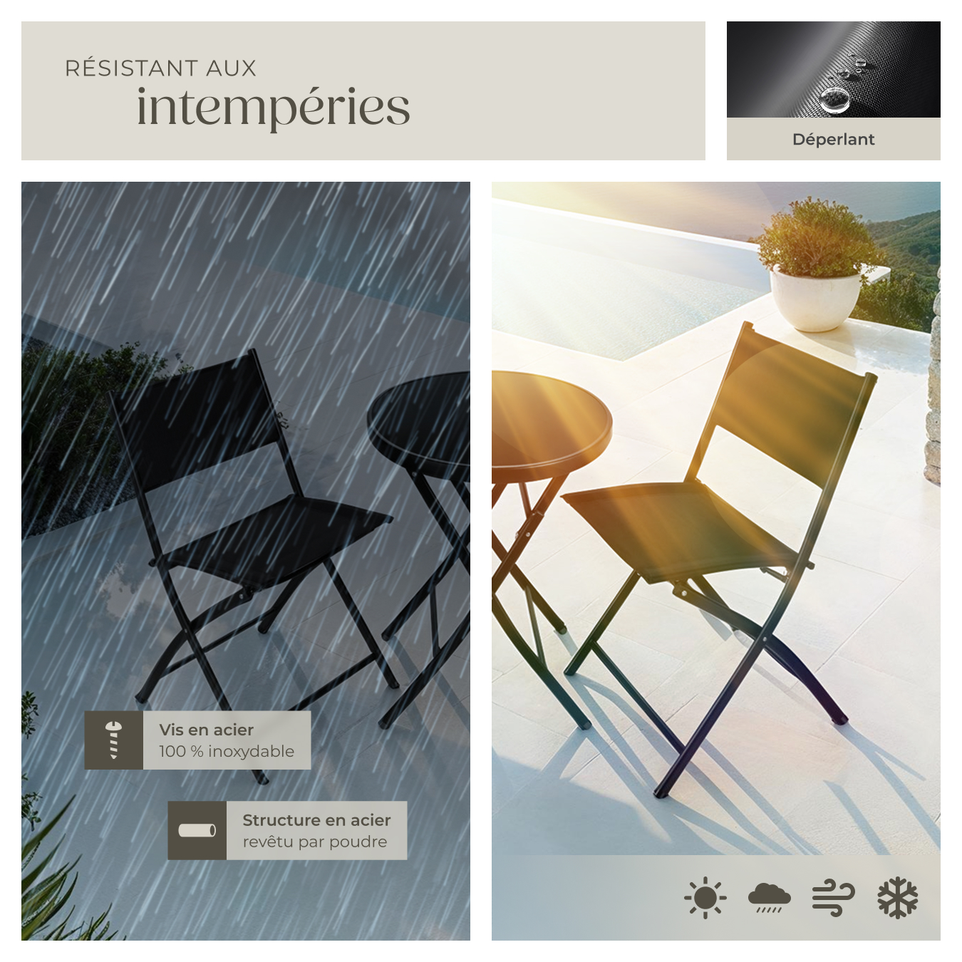 - Matériaux : Acier revêtu par poudre. / Textilène (70 % Polychlorure de vinyle, 30 % Polyester).