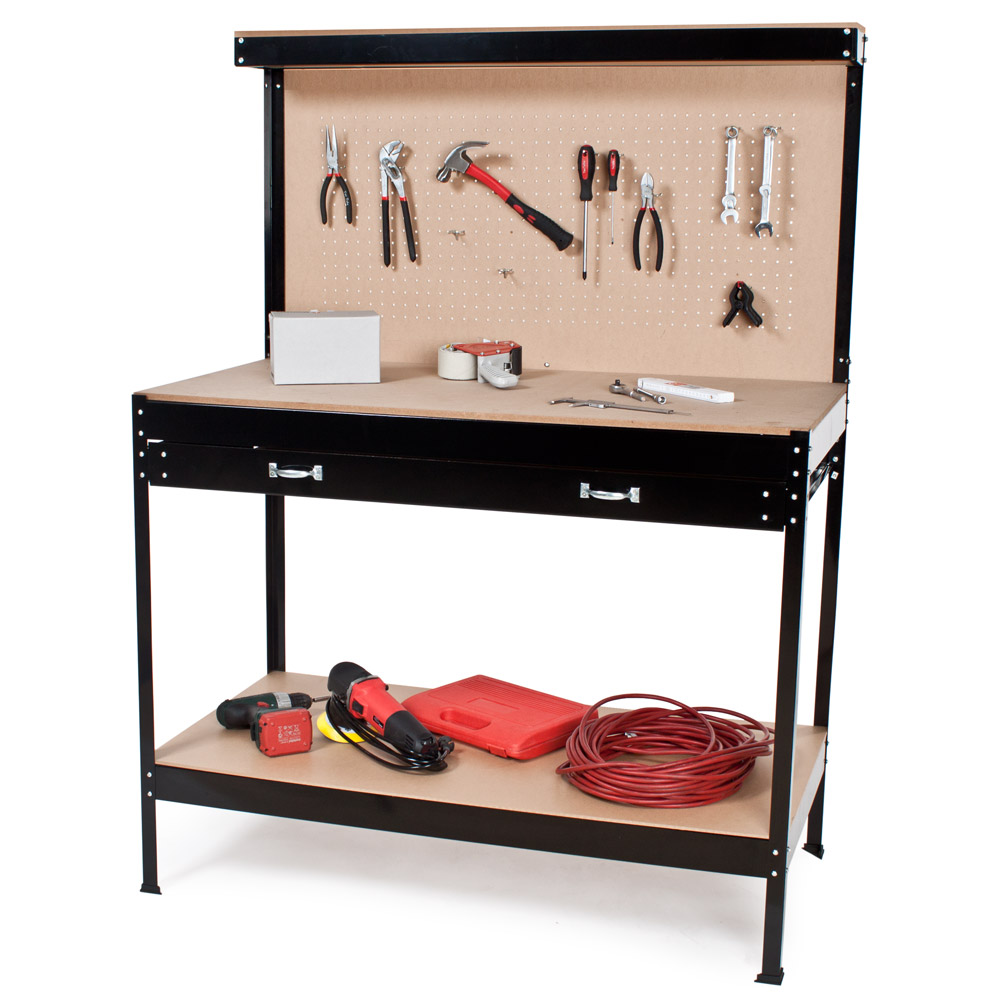 Établi d'atelier en bois et acier avec panneau à outils et tiroir de rangement TECTAKE. Cet établi universel est le meilleur équipement d'atelier pour les bricoleurs. Vos outils peuvent être stockés ici d'une manière claire et organisée et seront toujours à portée de main.