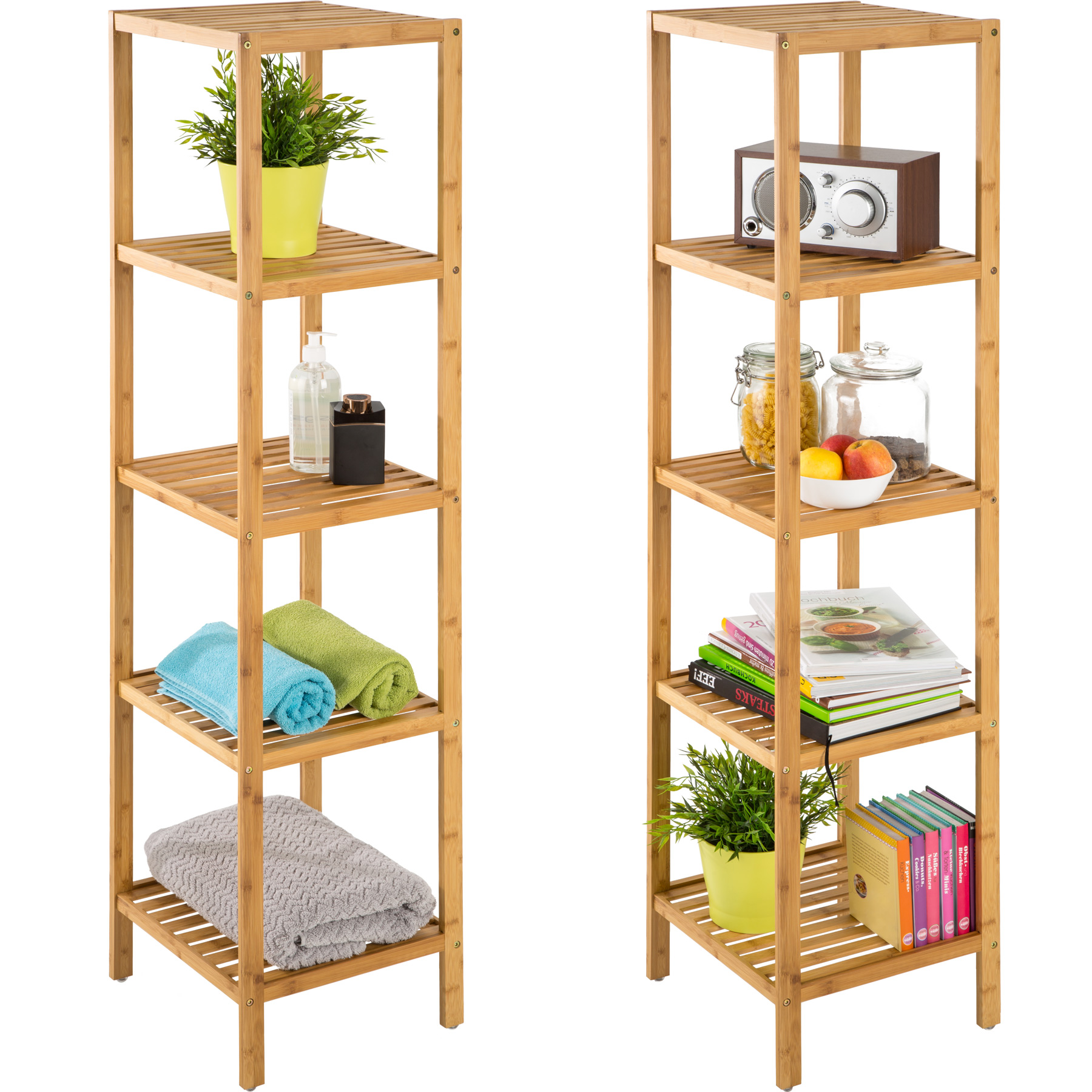 Étagère à salle de bains Bois de Bambou, Étagère Murale Colonne, Meuble de rangement 5 étages 33 cm x 33 cm x 141 cm TECTAKE. Cette étagère de salle de bain se distingue par sa qualité et son look moderne. La colonne sur pied en bambou laqué est équipée de 5 tablettes qui pourront stocker tout ce dont vous avez besoin : serviettes, linges, shampooing, gel douche, parfum et autres produits et beauté. Vous pouvez aussi l'utiliser dans d'autres pièces, pour ranger des livres ou des jouets par exemples.