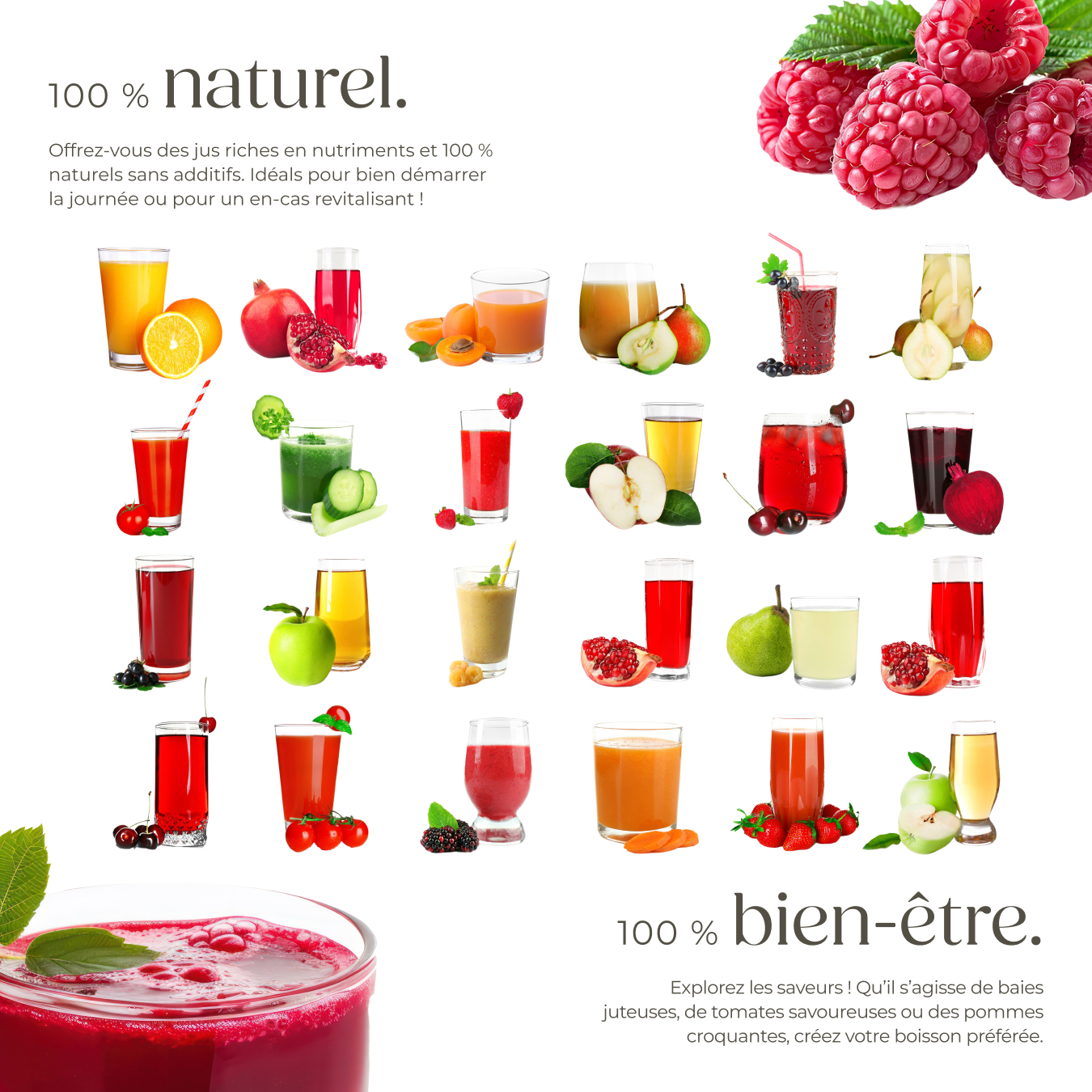 - Extracteur de jus puissant avec large ouverture de remplissage pour fruits et légumes