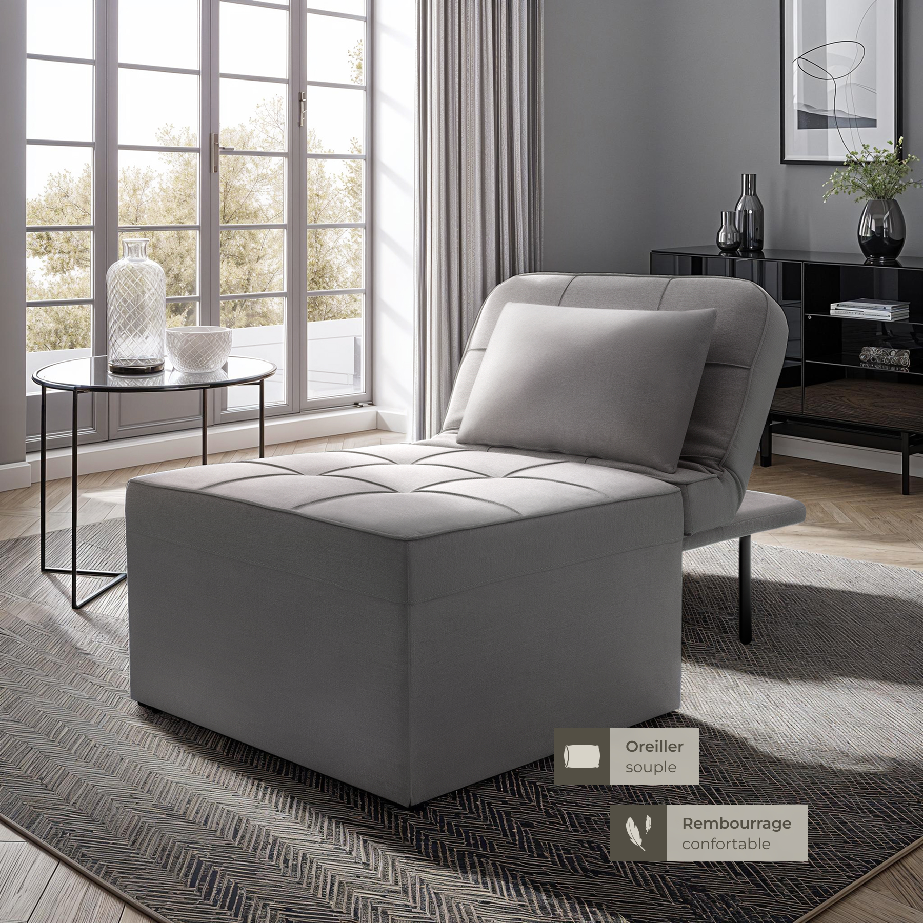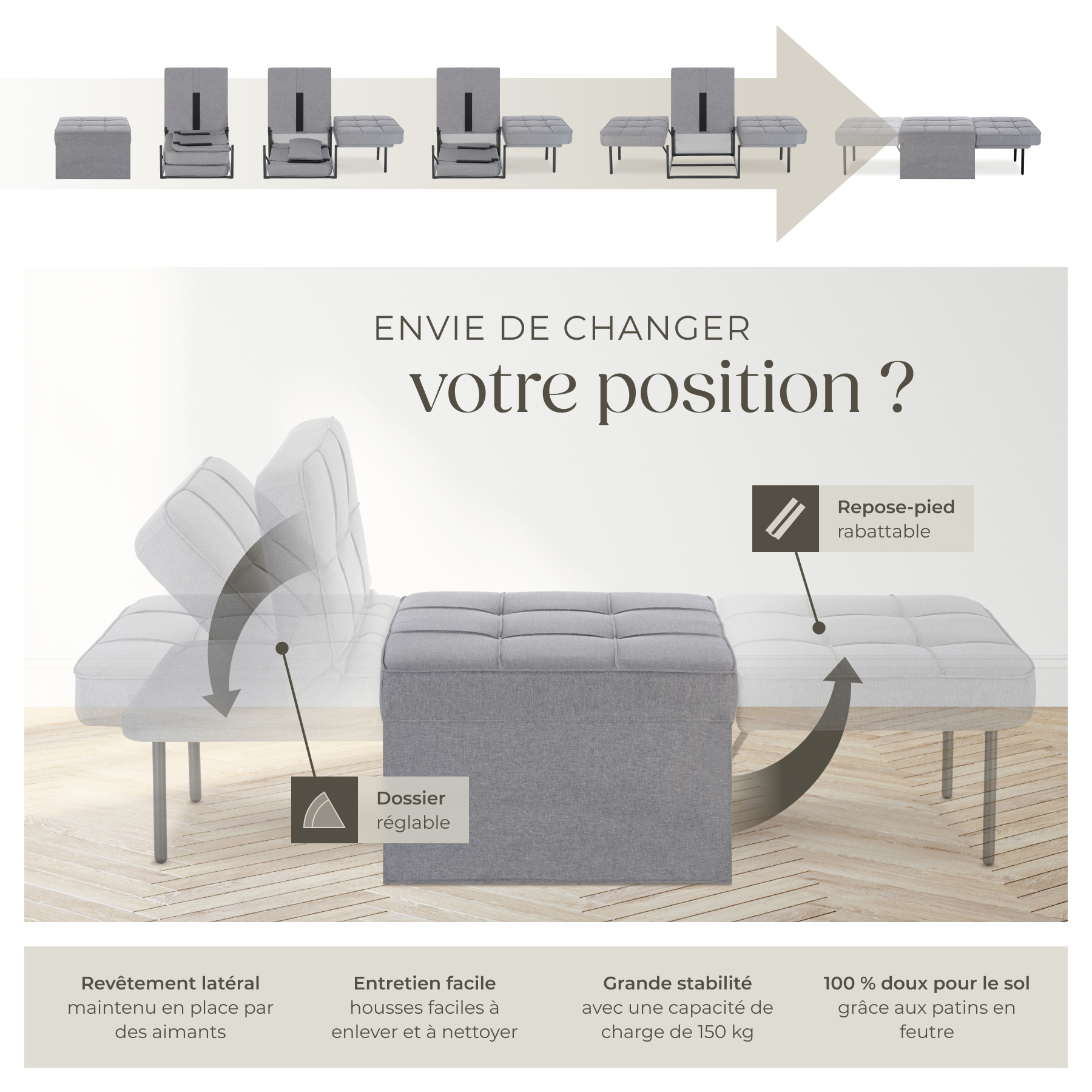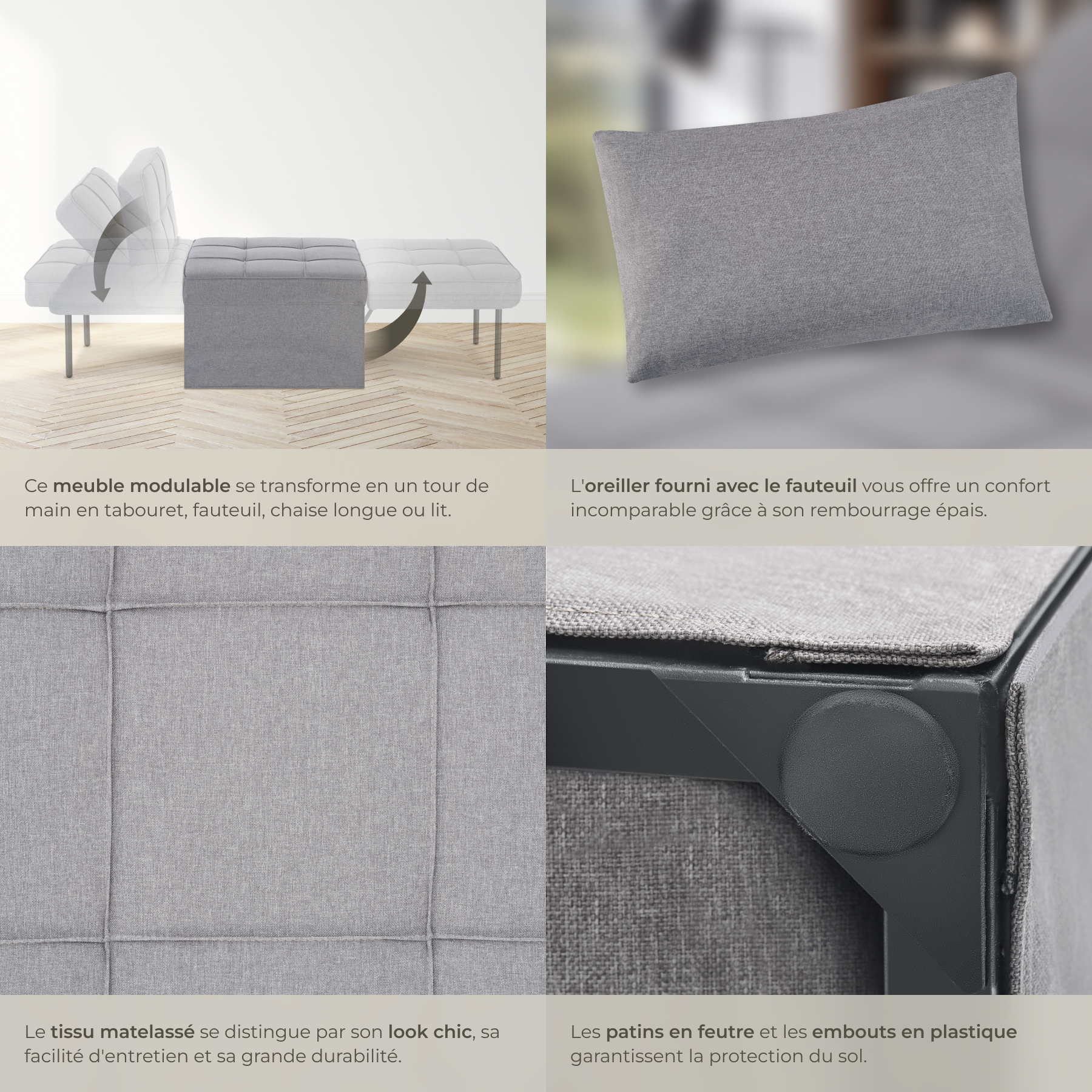- Fauteuil polyvalent à utiliser comme tabouret, fauteuil, chaise longue ou lit