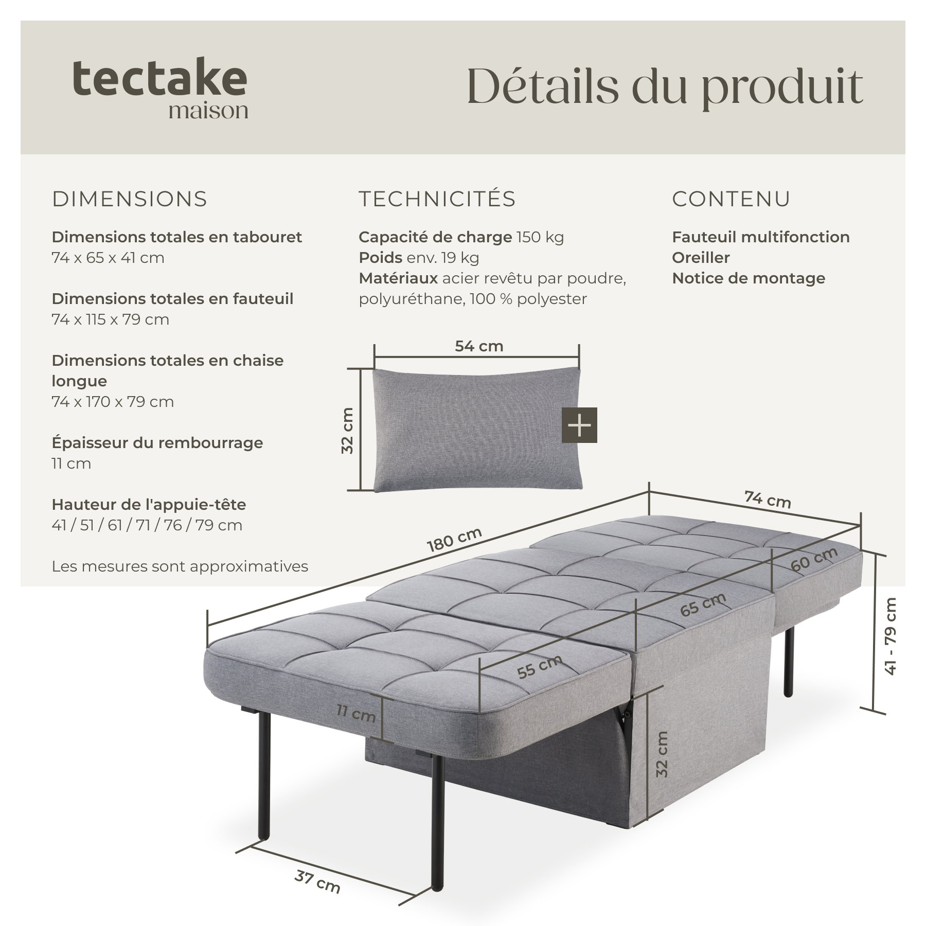 | Libellé | TECTAKE Fauteuil de repos 4-en-1 comme tabouret, fauteuil, chaise longue ou lit gris |