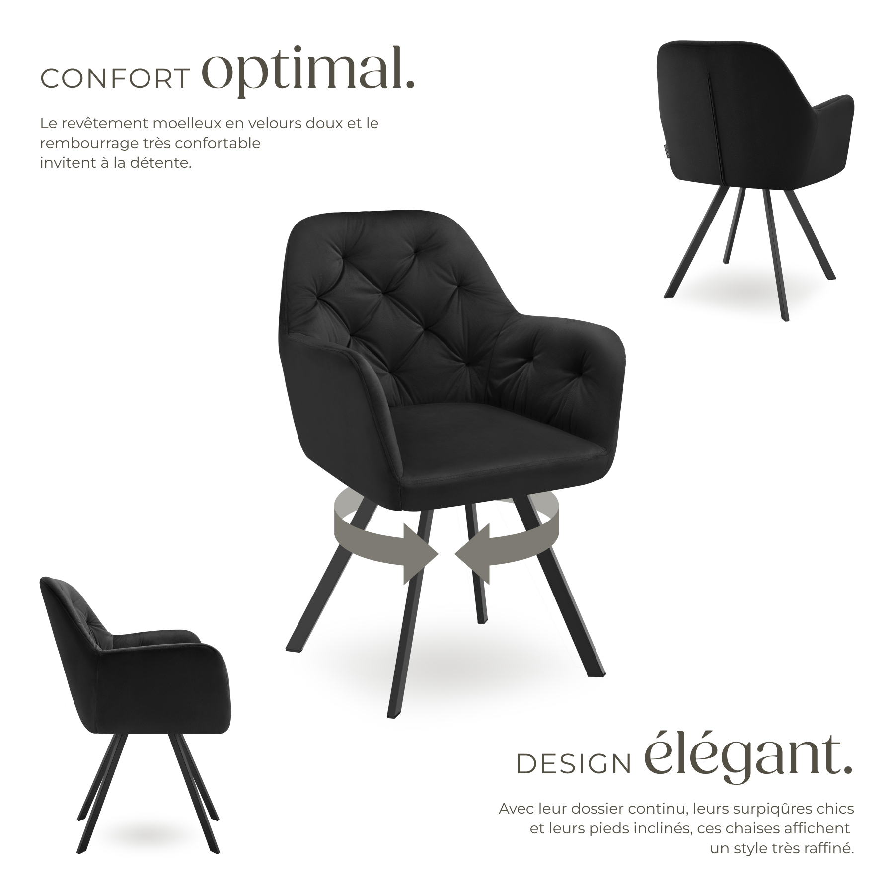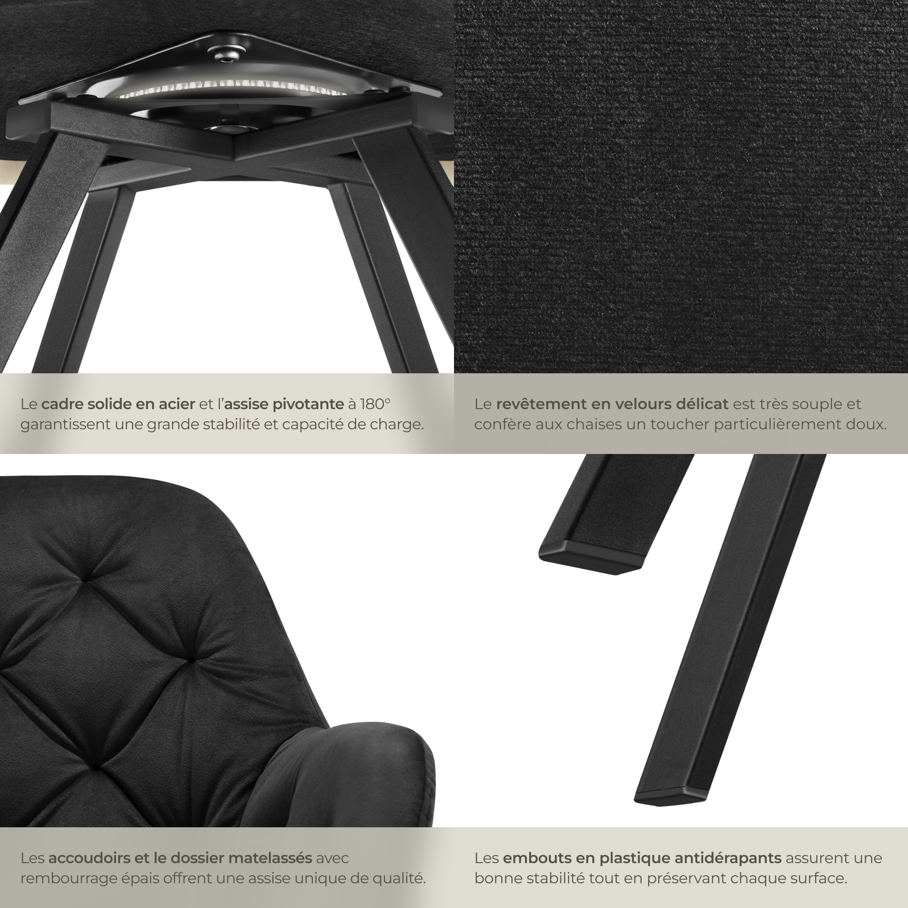 TECTAKE Fauteuil pivotant en velours avec accoudoirs rembourré avec motif matelassé Lot de 6 noir