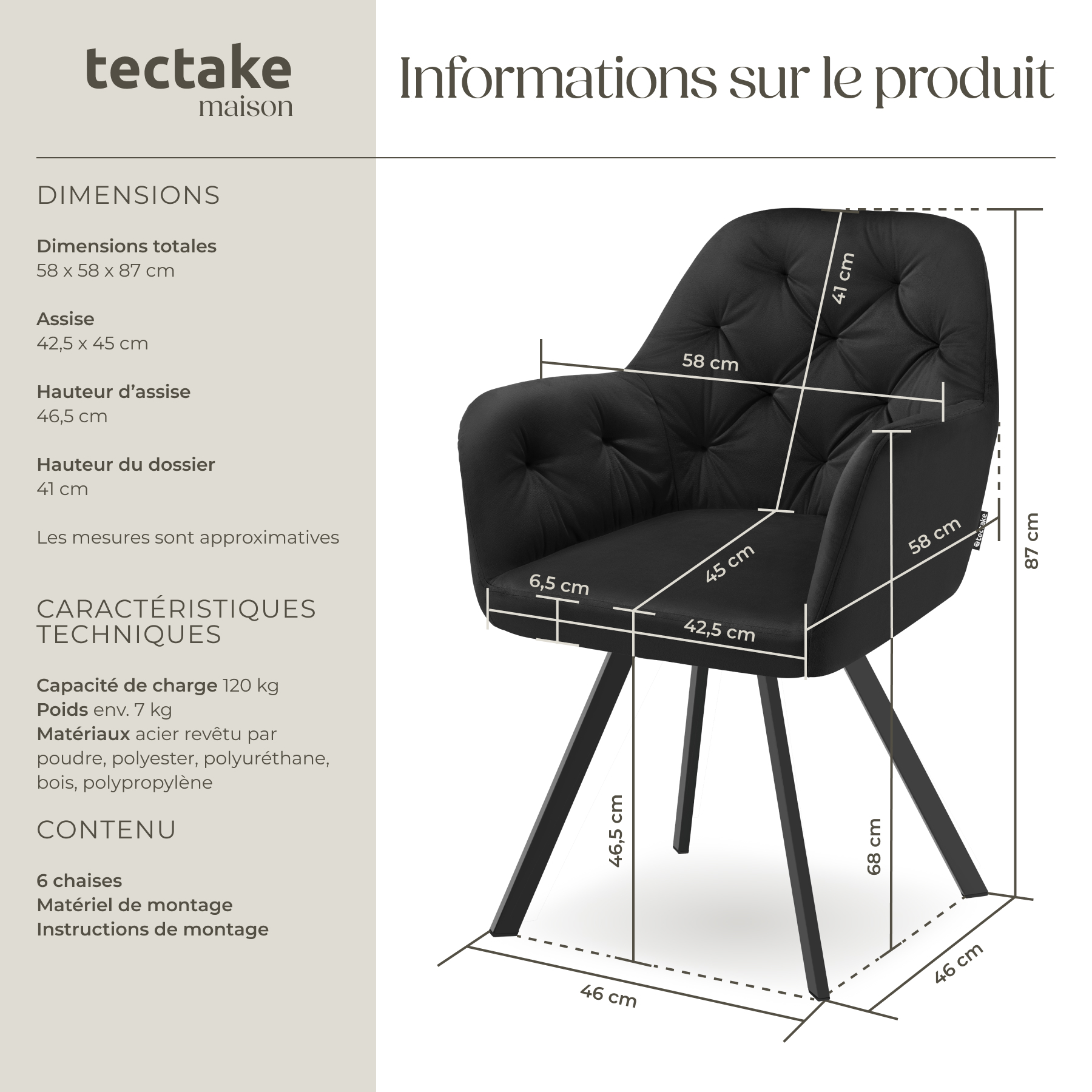 | Libellé | TECTAKE Fauteuil pivotant en velours avec accoudoirs rembourré avec motif matelassé Lot de 6 noir |