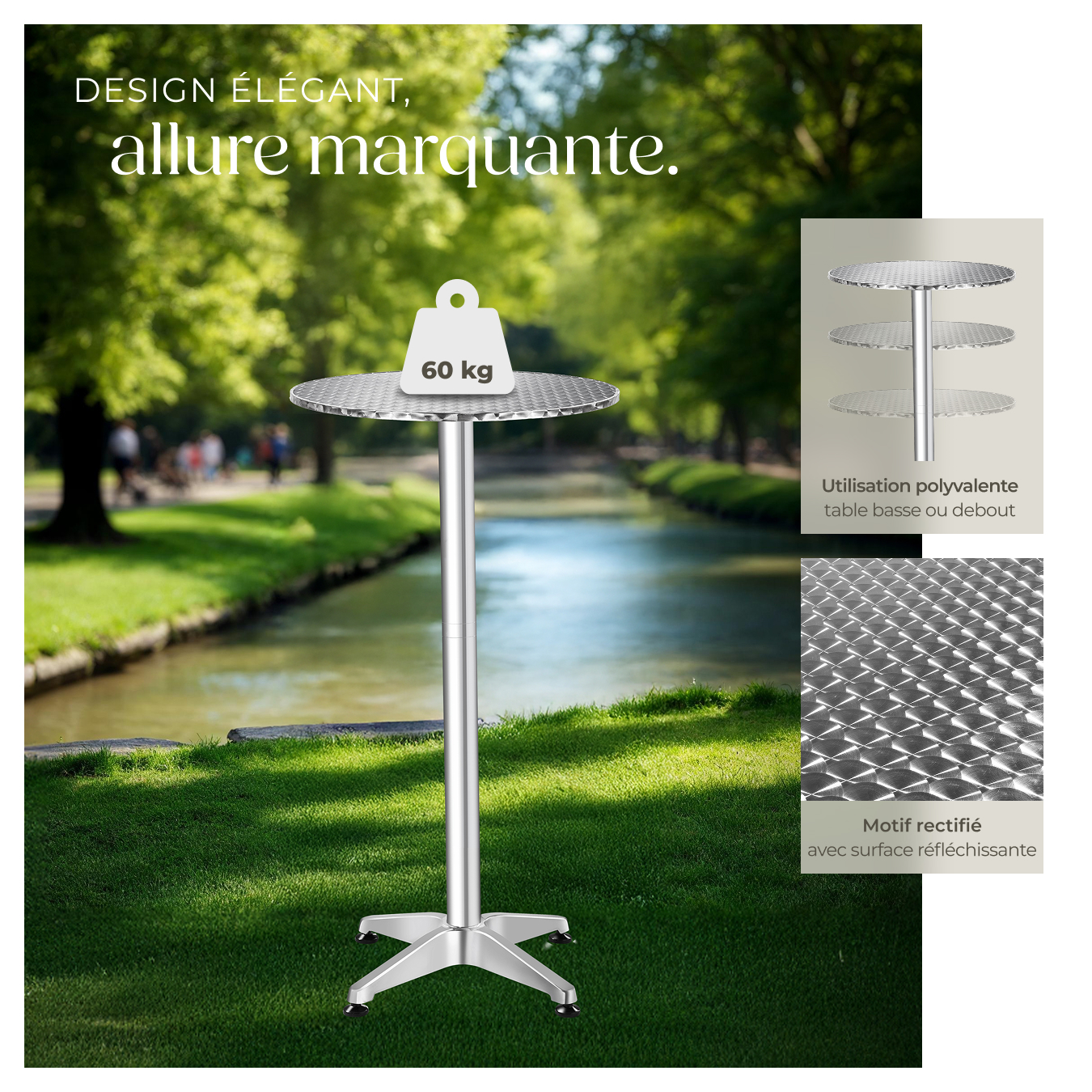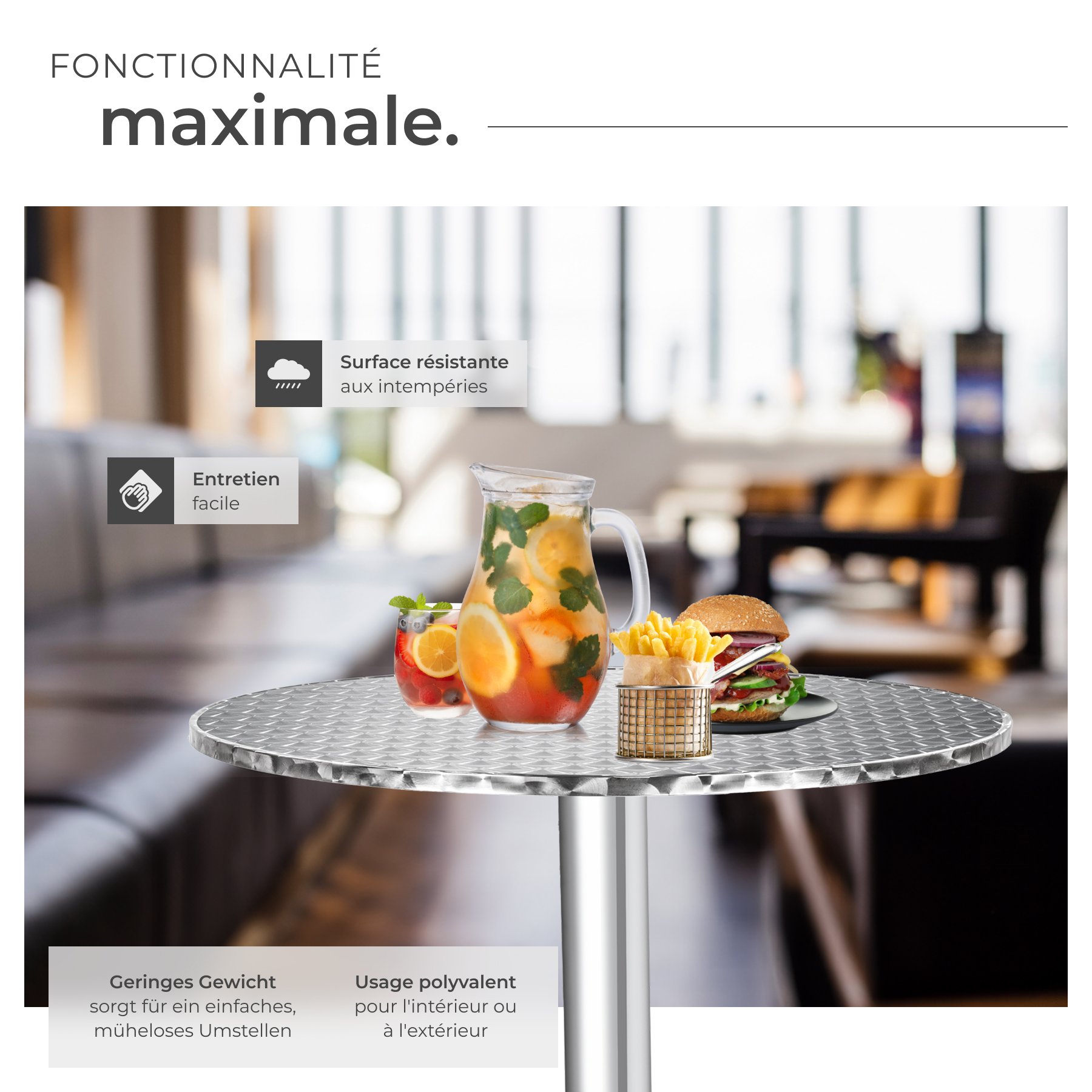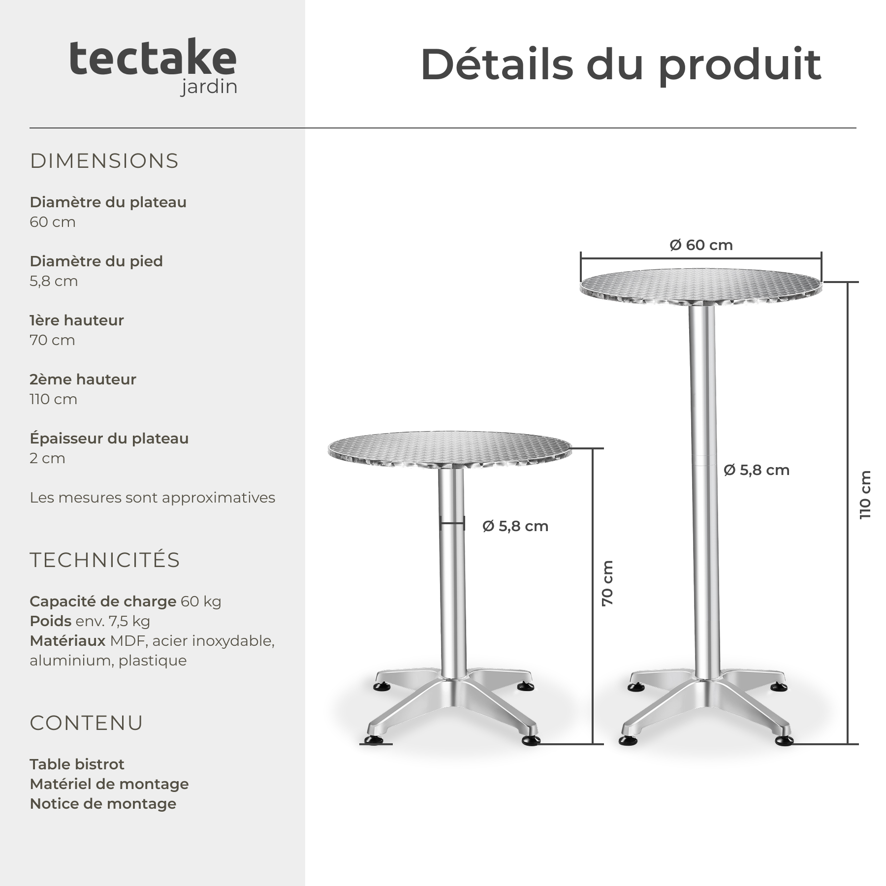 Table de bar, Table de bistro, Table Haute, Table de Jardin, Table Aluminium Ø 60 cm - Hauteur réglable TECTAKE - 8,6 Kg. Cette table de bistrot en aluminium est très polyvalente. Peu importe l'événement, que ce soit un mariage, un baptême, un barbecue, une réception, une fête dans le jardin, une réception dans une salle des fêtes, etc. Cette table de bistrot, de bar est parfaitement adaptée à votre fête et à toutes circonstances ! Vous pouvez l'utiliser aussi bien à l'intérieur qu‘à l'extérieur. La table peut être montée rapidement sur 2 niveaux, de sorte qu'elle puisse être utilisée comme une table de bistrot debout ou comme une table à manger en position assise. Le plateau MDF est recouvert d'acier inoxydable poli.