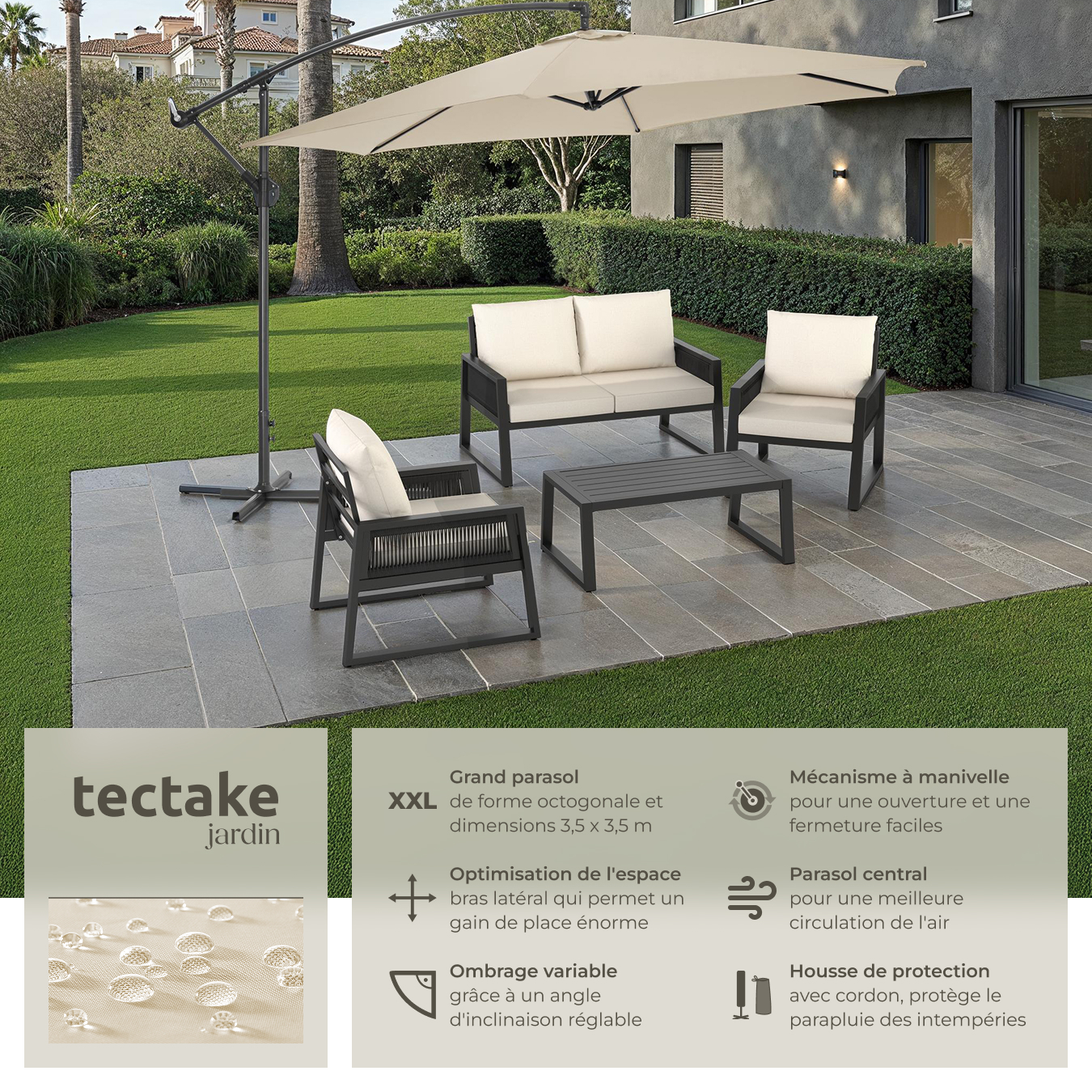 - Diamètre du parasol : 3,5 m.