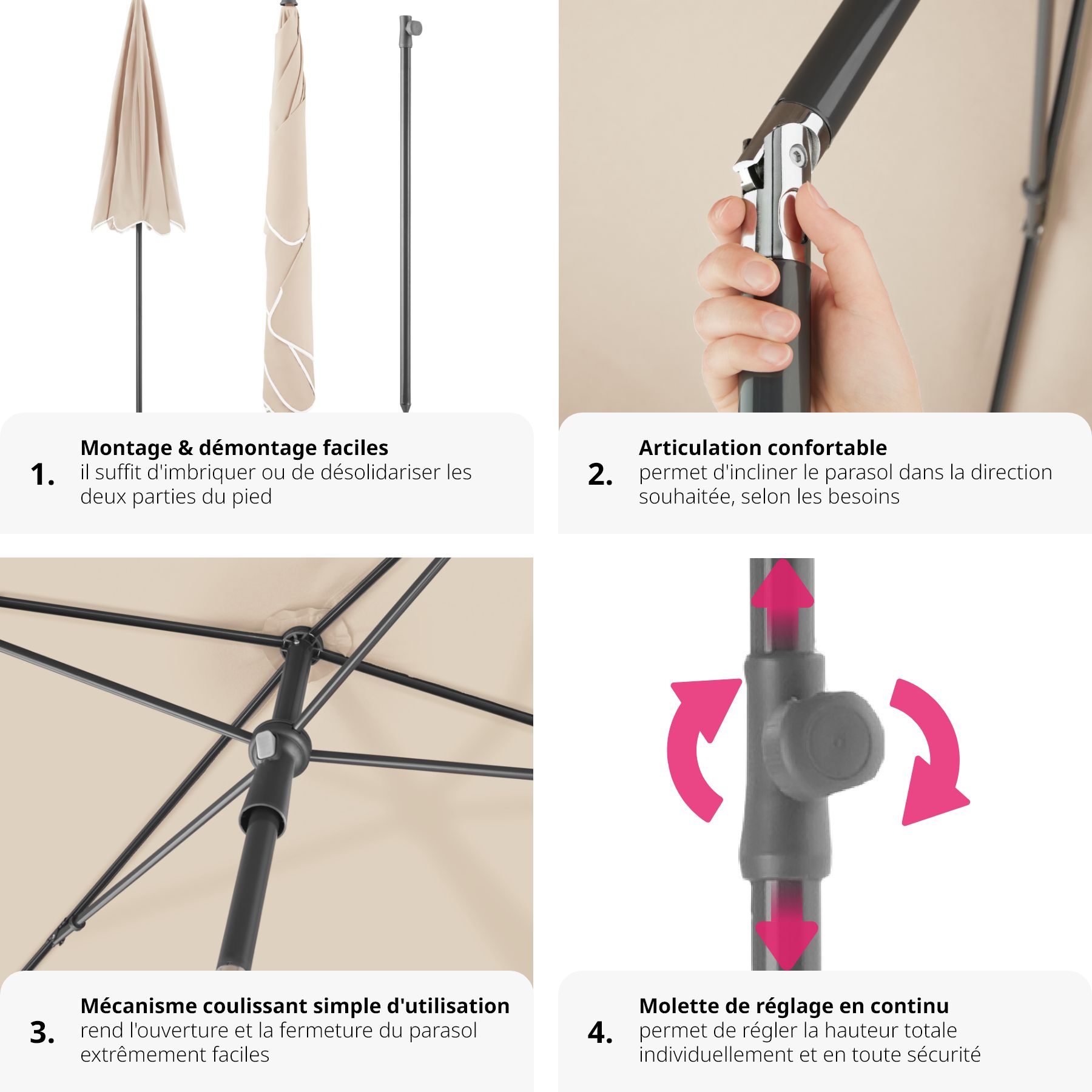 TECTAKE Parasol 200 x 125 cm Mécanisme facile à manipuler