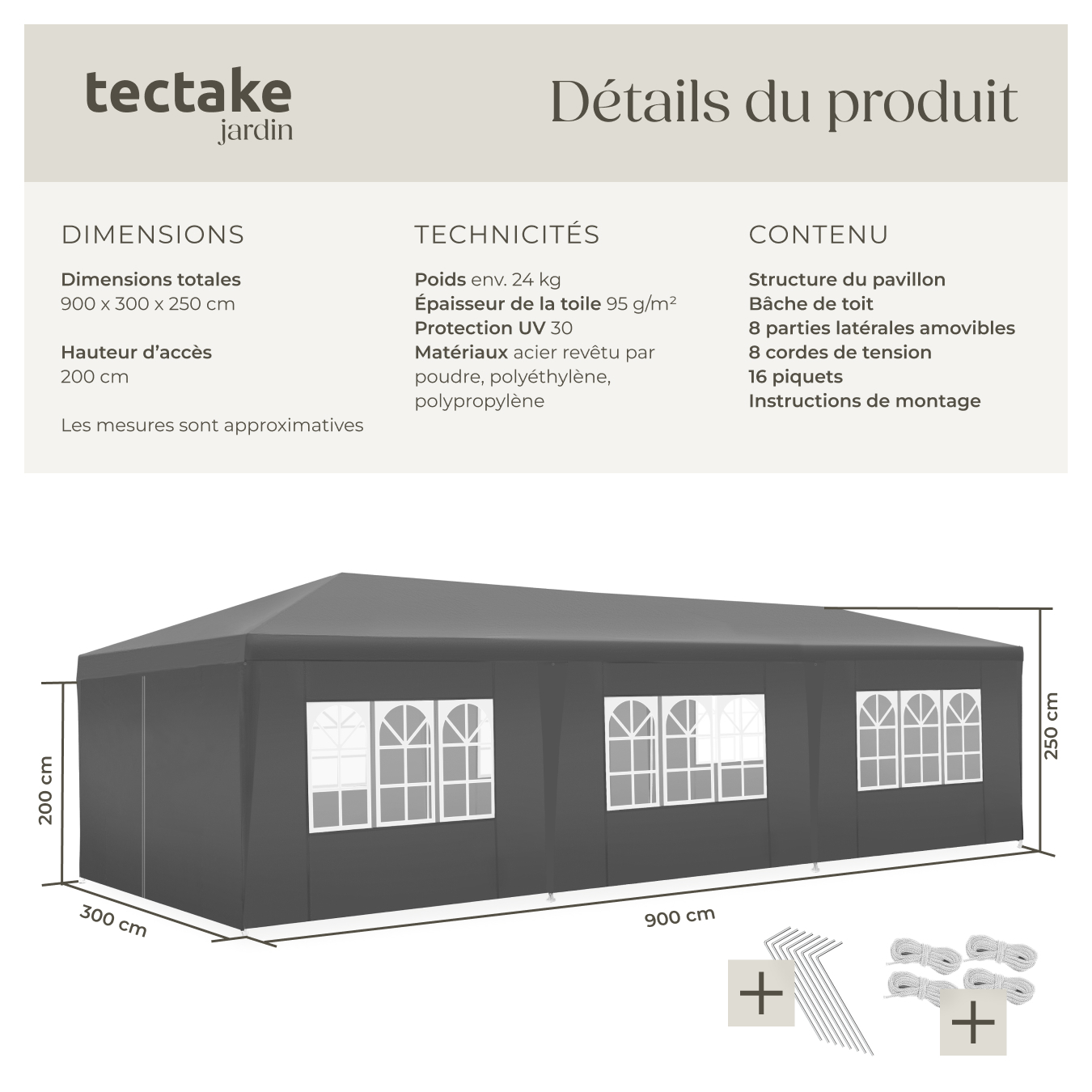 | Libellé | TECTAKE Pavillon 9 x 3 m en système emboîtable gris |