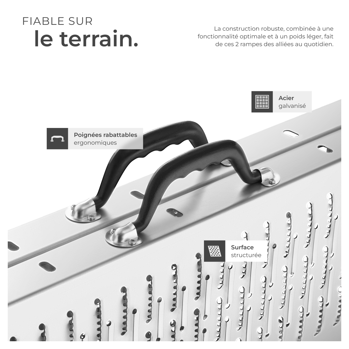 - Jeu de 2 rampes d'accès d'une grande longueur totale pour une utilisation variée