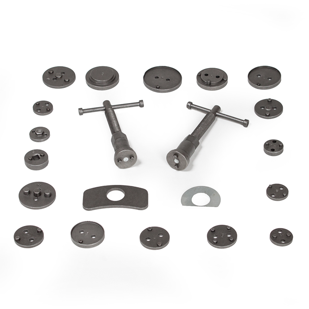 Repousse Piston étrier de freins universel 22 Pcs TECTAKE. Le coffret de 22 pièces de remise à zéro de piston et étrier de frein est composé d'une bobine avec filetages à gauche et à droite. Il est très solide et facile d'emploi, son utilisation fait gagner énormément de temps pour le remplacement des plaquettes. Avec les 17 plaques d'adaptateur, vous pouvez remettre à zéro sans problème les pistons des systèmes classiques de frein de presque toutes les voitures. À l'aide de cet outil, il est possible, sans forcer et sans voiler le piston de frein, de le presser / tourner à nouveau dans sa position de départ.
