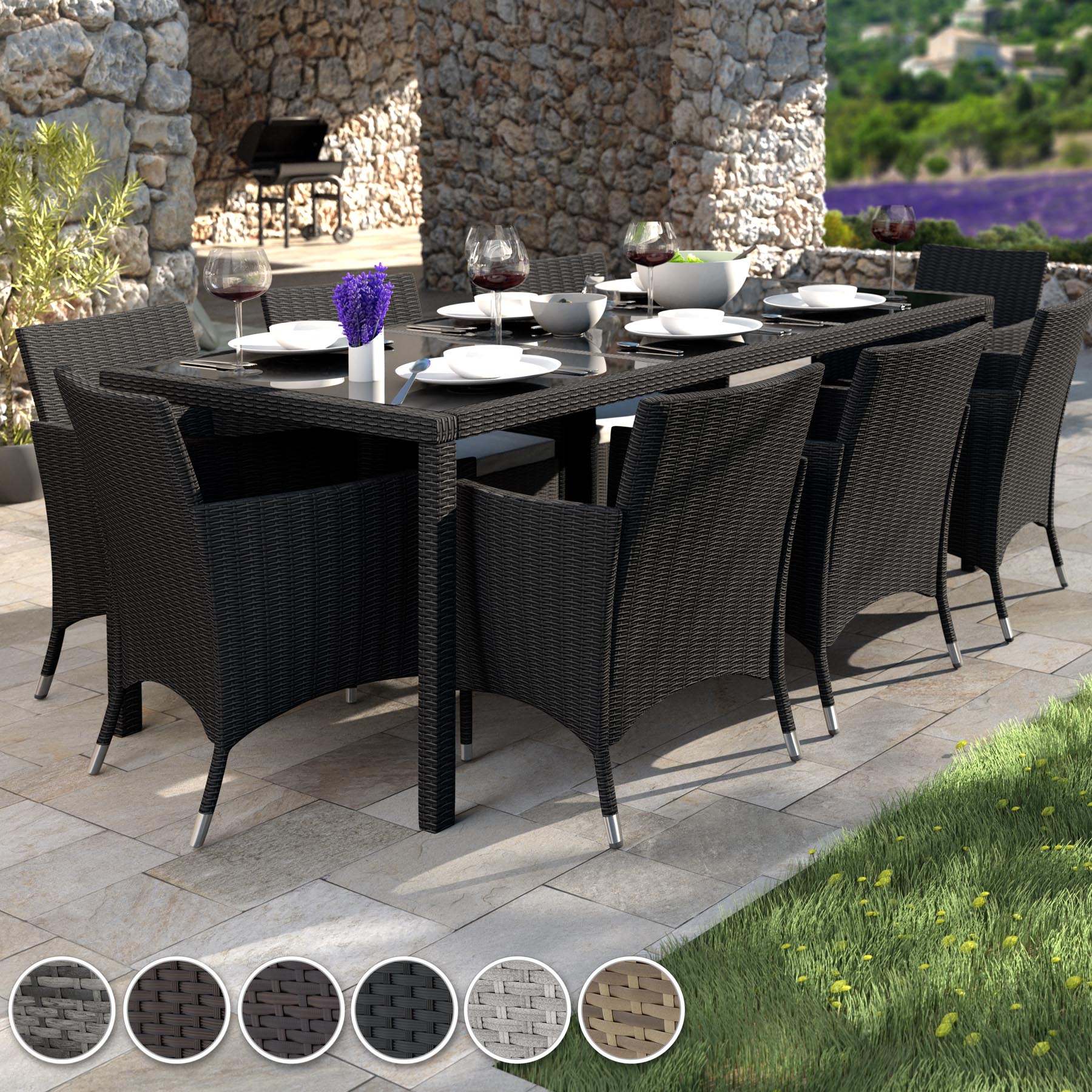 Retrouvez-vous autour d'un repas avec notre salon de jardin VALENCE 8 places tectake. Invitez amis et famille à s'installer dans l'un des fauteuils de jardin et à passer un agréable moment convivial. Les accoudoirs et les coussins d'assise incitent à s'attarder autour de la table recouverte de plateaux de verre. Les chaises et la table ont une structure en acier recouverte de résine tressée. Ce matériau - d'allure similaire à celle du rotin naturel - est robuste et résiste aux conditions extérieures. Vous pouvez donc installez votre salon de jardin dehors au jardin, sur votre terrasse ou bien en intérieur : véranda, jardin d'hiver ou même dans votre salon. Grâce au poids léger de la table et des chaises, déplacer les éléments est facile. Une fois la belle saison passée, remisez votre salon de jardin en le protégeant avec la housse de protection incluse dans la livraison. Les coussins sont déhoussables, la housse au revêtement hydrofuge est lavable.