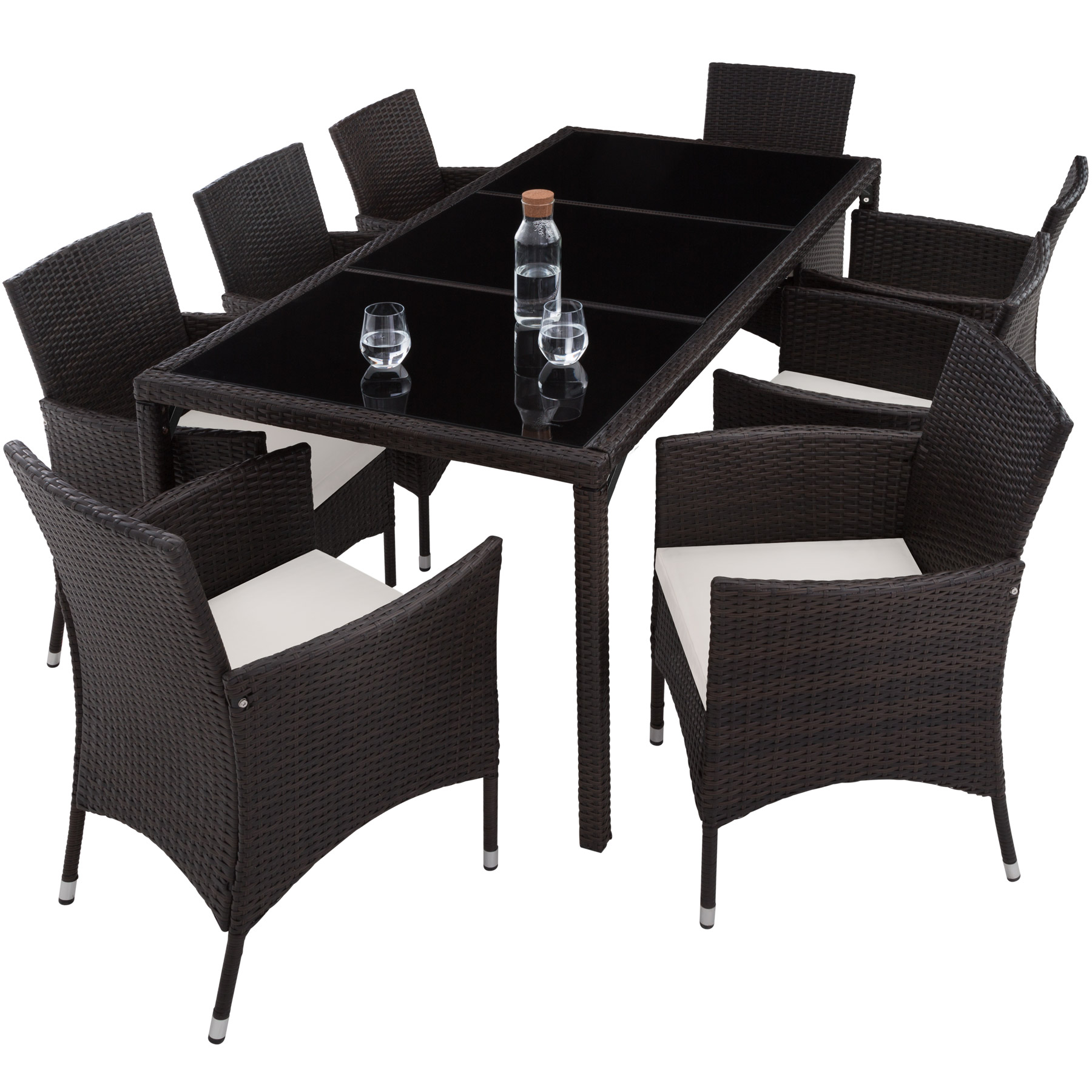 Retrouvez-vous autour d'un repas avec notre salon de jardin VALENCE 8 places tectake. Invitez amis et famille à s'installer dans l'un des fauteuils de jardin et à passer un agréable moment convivial. Les accoudoirs et les coussins d'assise incitent à s'attarder autour de la table recouverte de plateaux de verre. Les chaises et la table ont une structure en acier recouverte de résine tressée. Ce matériau - d'allure similaire à celle du rotin naturel - est robuste et résiste aux conditions extérieures. Vous pouvez donc installez votre salon de jardin dehors au jardin, sur votre terrasse ou bien en intérieur : véranda, jardin d'hiver ou même dans votre salon. Grâce au poids léger de la table et des chaises, déplacer les éléments est facile. Une fois la belle saison passée, remisez votre salon de jardin en le protégeant avec la housse de protection incluse dans la livraison. Les coussins sont déhoussables, la housse au revêtement hydrofuge est lavable.