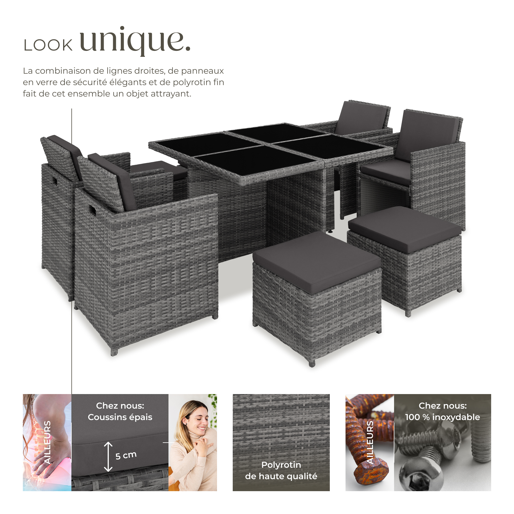 Pour compléter ce magnifique salon de jardin MANHATTAN, nous avons inclus des accessoires pratiques tels que des coussins confortables et une housse de protection. Que vous souhaitiez passer des après-midi ensoleillés à l'extérieur ou des soirées tranquilles dans votre jardin d'hiver, ce salon de jardin est conçu pour répondre à tous vos besoins.