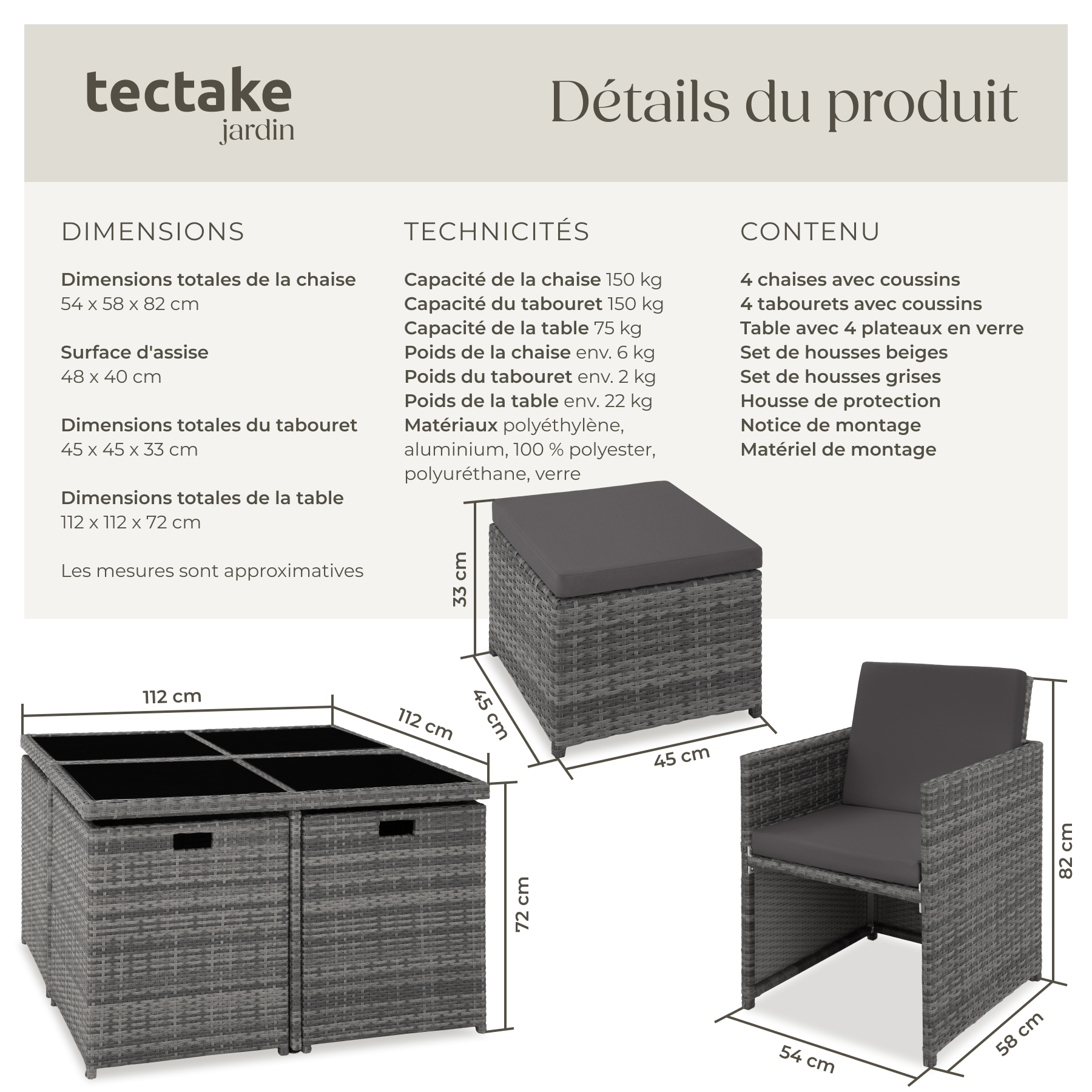 - Dimension des tabourets (LxPxH) : environ 45 x 45 x 33 cm