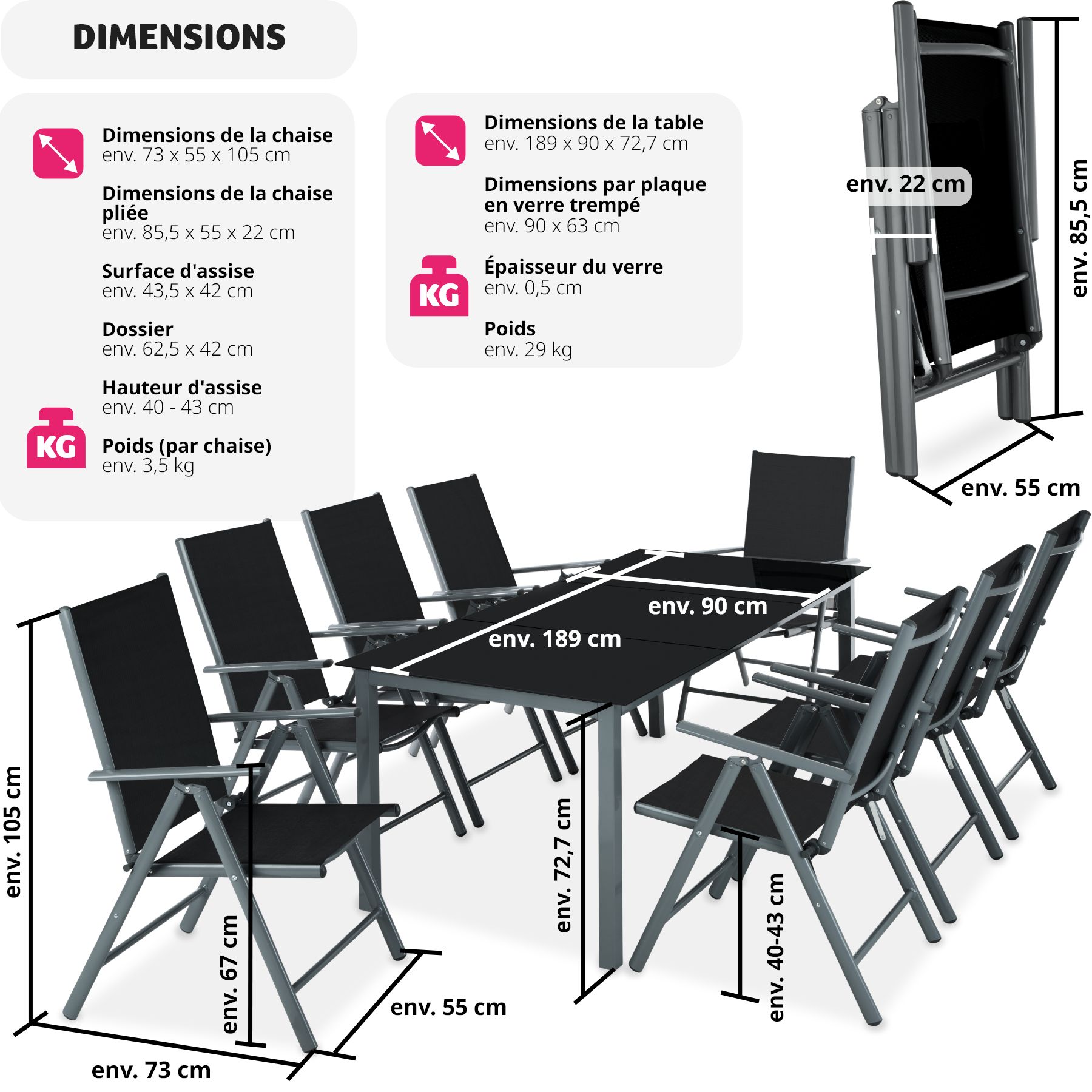 - Poids de chaque chaise : 3,5 kg