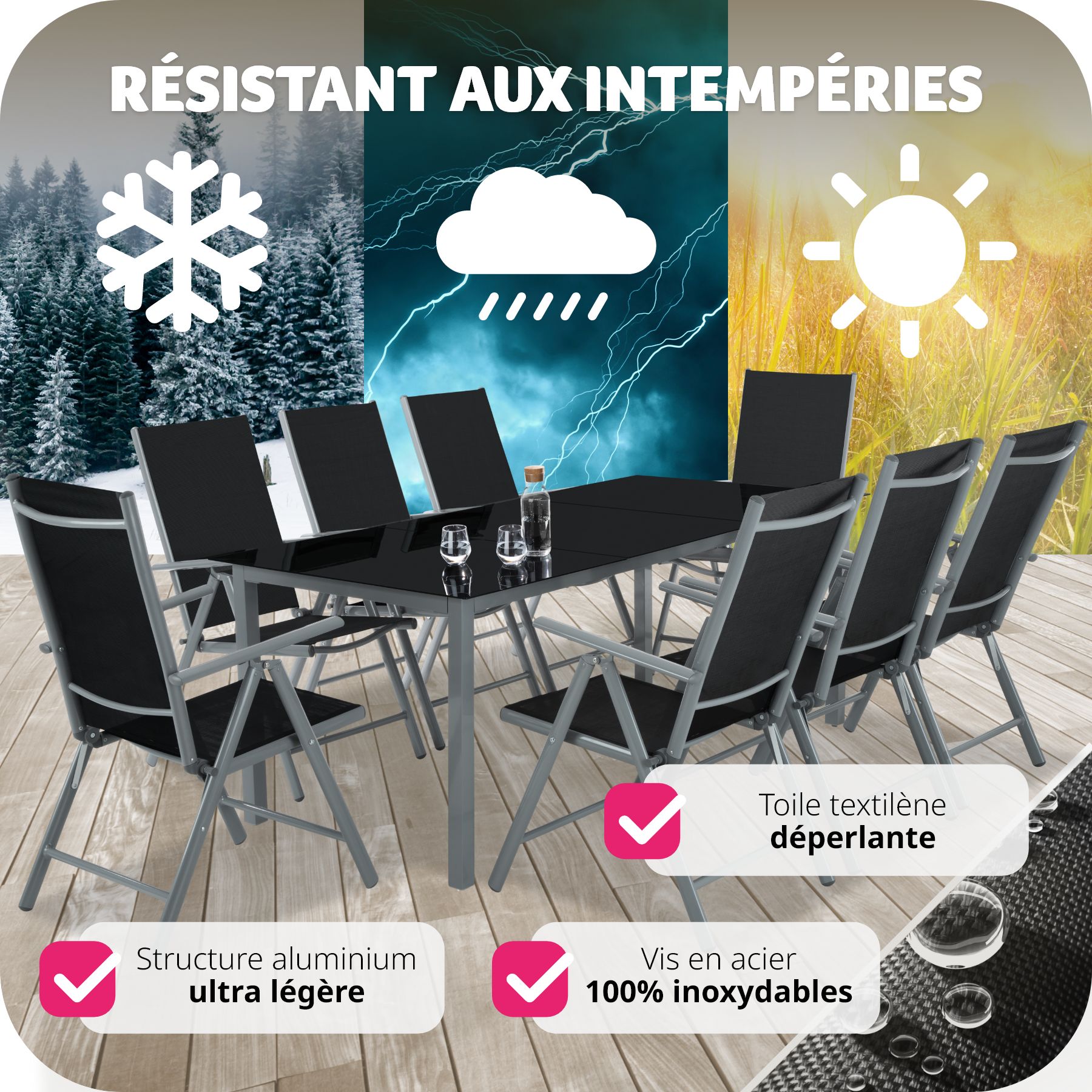 Salon de Jardin avec 8 Chaises Pliantes et 1 Table en Verre et en Aluminium TECTAKE. Le salon de jardin durable en aluminium va vous séduire par son design moderne. Ses chaises confortables et sa table élégante vous invitent à des moments agréables. La table massive est dotée d'une plateau en verre trempé esthétique et d'un support en aluminium revêtu par poudre. Elle offre suffisamment de place pour de nombreux invités. Les 8 chaises sont réalisées en aluminium stable, ce qui les rend légères. Elles sont inclinables et possèdent un dossier haut qui vous apporte plus de confort. Les chaises peuvent être pliées et rangées en quelques instants, de manière peu encombrante. Ce salon de jardin crée une ambiance conviviale chez vous. Il convient aussi bien pour l'extérieur que pour l'intérieur!