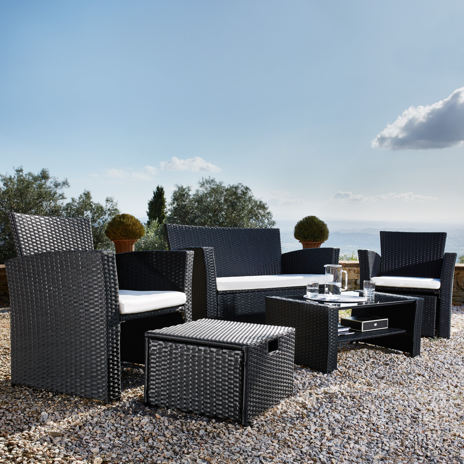 Notre salon de jardin Modena 4 places allie design contemporain et confort. Installez-vous et prenez vos aises : laissez reposer vos jambes sur les poufs et prenez un café autour de la jolie table basse. Le canapé et les fauteuils de jardin robustes ont une structure en acier recouverte de résine tressée haut de gamme. La résine tressée - bonne alternative au rotin naturel - s'entretient très bien en plus d'être légère et résistante aux intempéries. Le plus de notre salon de jardin ? Ce mobilier de jardin est malin : le canapé renferme un coffre dans lequel vous pouvez stocker les coussins d'assise, des jeux d'enfants ou des revues, les poufs s'encastrent sous les fauteuils. Une fois la belle saison passée, regroupez tous les éléments ensemble et couvrez-les à l'aide de la housse de protection incluse dans la livraison.