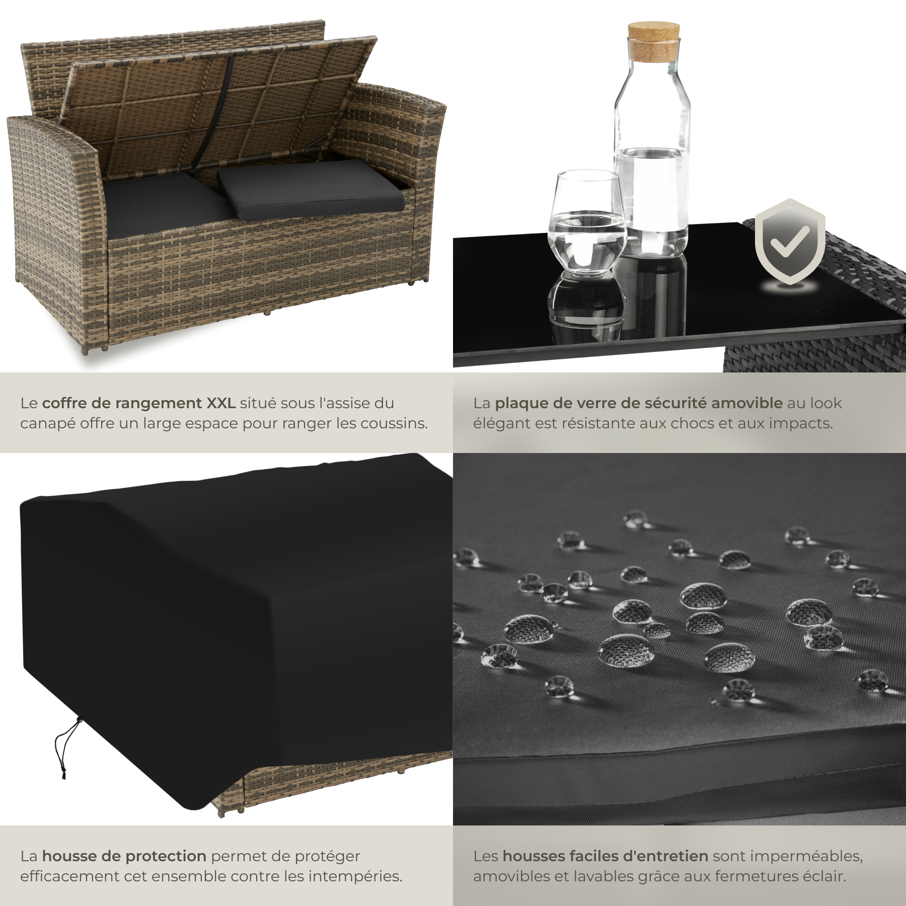 Le centre de ce magnifique ensemble de jardin est une table en verre trempé, offrant une surface spacieuse pour vos boissons, snacks, et accessoires divers. La table dispose également d'un étage inférieur pour ranger magazines, livres et autres objets plats. Le canapé intègre un compartiment de rangement spacieux sous l'assise, idéal pour stocker les coussins et autres accessoires de jardin.