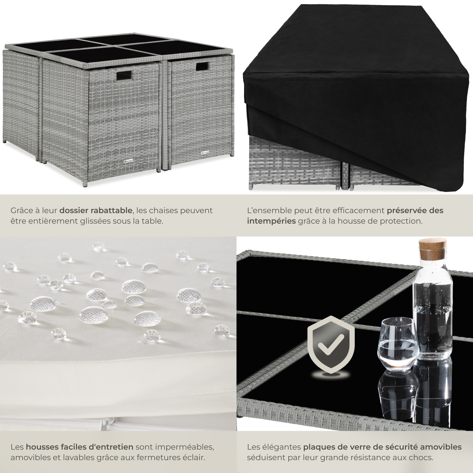 Savourez l'été en famille autour de notre salon de jardin BILBAO 8 places ! Notre mobilier de jardin en résine tressée offre des places ultra confortables pour 4 personnes avec repose pieds, ou bien pour 8 en utilisant les tabourets ! Ce salon de jardin encastrable est pratique d'utilisation car ses fauteuils disposent de dossiers rabattables qui viennent se glisser entièrement sous la table, avec les tabourets. Une fois replié, l'ensemble de jardin ne prend qu'un minimum de place : idéal pour le remisage hivernal. Sa taille compacte lui permet de trouver sa place aussi bien dans le jardin sur votre terrasse, que sur un balcon en appartement. Son tissage en résine tressée d'apparence similaire au rotin naturel fait de ce meuble un excellent mobilier d'intérieur pour votre salon, véranda ou jardin d'hiver. En plus d'être résolument tendance et design, la résine tressée est un matériau robuste et facile d'entretien : un chiffon humide ou une éponge permet de faire disparaitre les traces de pluie ou de poussière. Les coussins d'assise ont une housse hydrofuge amovible lavable. Pour une durée de vie prolongée, une housse de protection est livrée avec le salon de jardin.