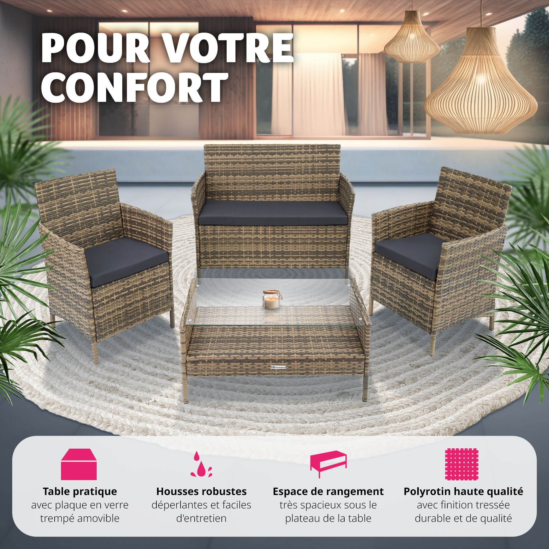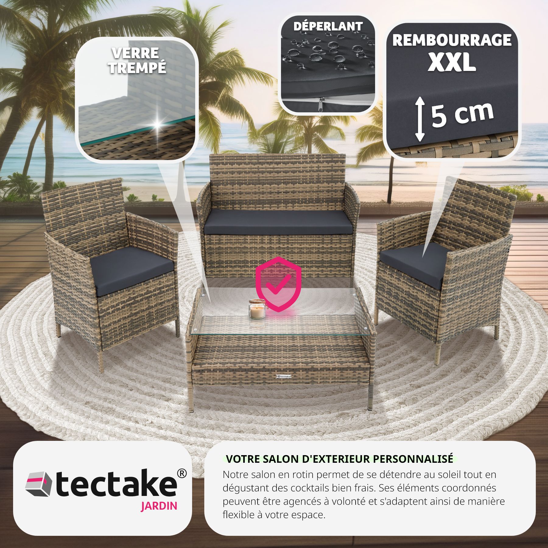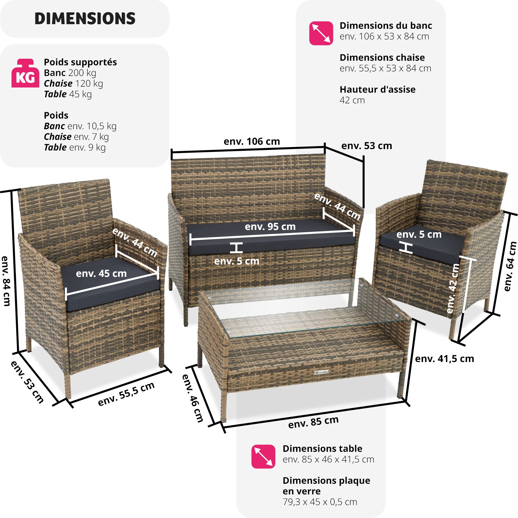 Salon de jardin MADERE - 2 Chaises Fauteuils, 1 Banc, 1 Table en Résine Tressée Structure Acier Marron TECTAKE. Vous voulez profiter au mieux de votre jardin, votre terrasse ou de votre balcon ? Ce salon de jardin robuste, facile d'entretien et au design élégant trouvera sa place chez vous. Avec leur cadre léger en acier et leur tressage en poly rotin, vous pouvez utiliser les deux fauteuils et le banc en extérieur comme en intérieur. La table basse possède un support de rangement sous le plateau amovible en verre de sécurité massif. Les housses amovibles sont parfaitement assorties aux couleurs des chaises et de la table et se nettoient aisément à l'aide d'un chiffon humide. Profitez de belles soirées au soleil sur votre terrasse ou dans votre jardin, confortablement installé sur les fauteuils de ce salon de jardin.