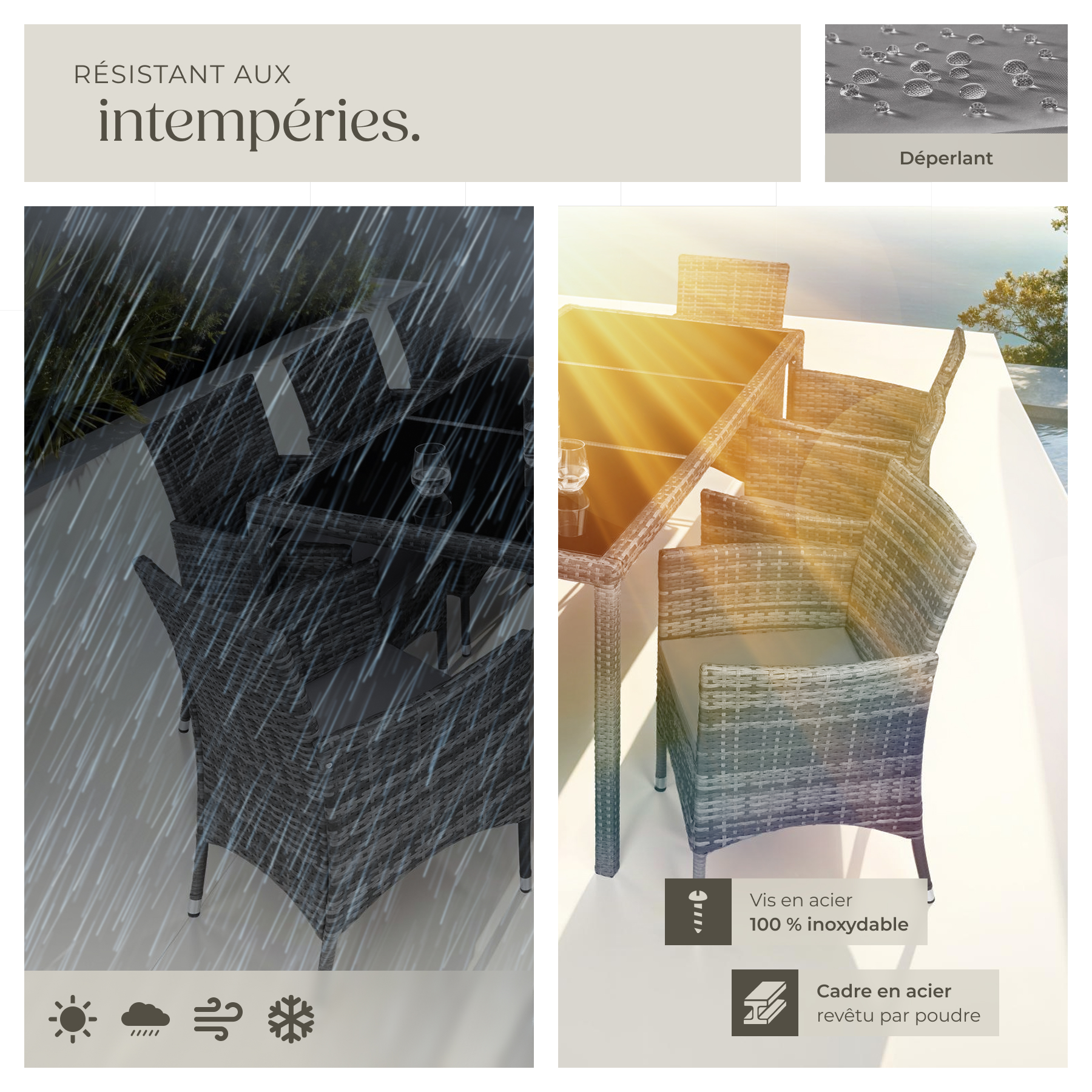 Le salon de jardin VALENCIA est doté de fauteuils avec coussins d'assise confortables, garantissant un confort optimal pendant vos moments de détente. La résine tressée utilisée pour ce meuble extérieur est non seulement facile à entretenir, mais également résistante aux UV, ce qui assure une durabilité exceptionnelle face aux éléments naturels. Les plateaux en verre de sécurité ajoutent une touche de sophistication tout en étant extrêmement pratiques.