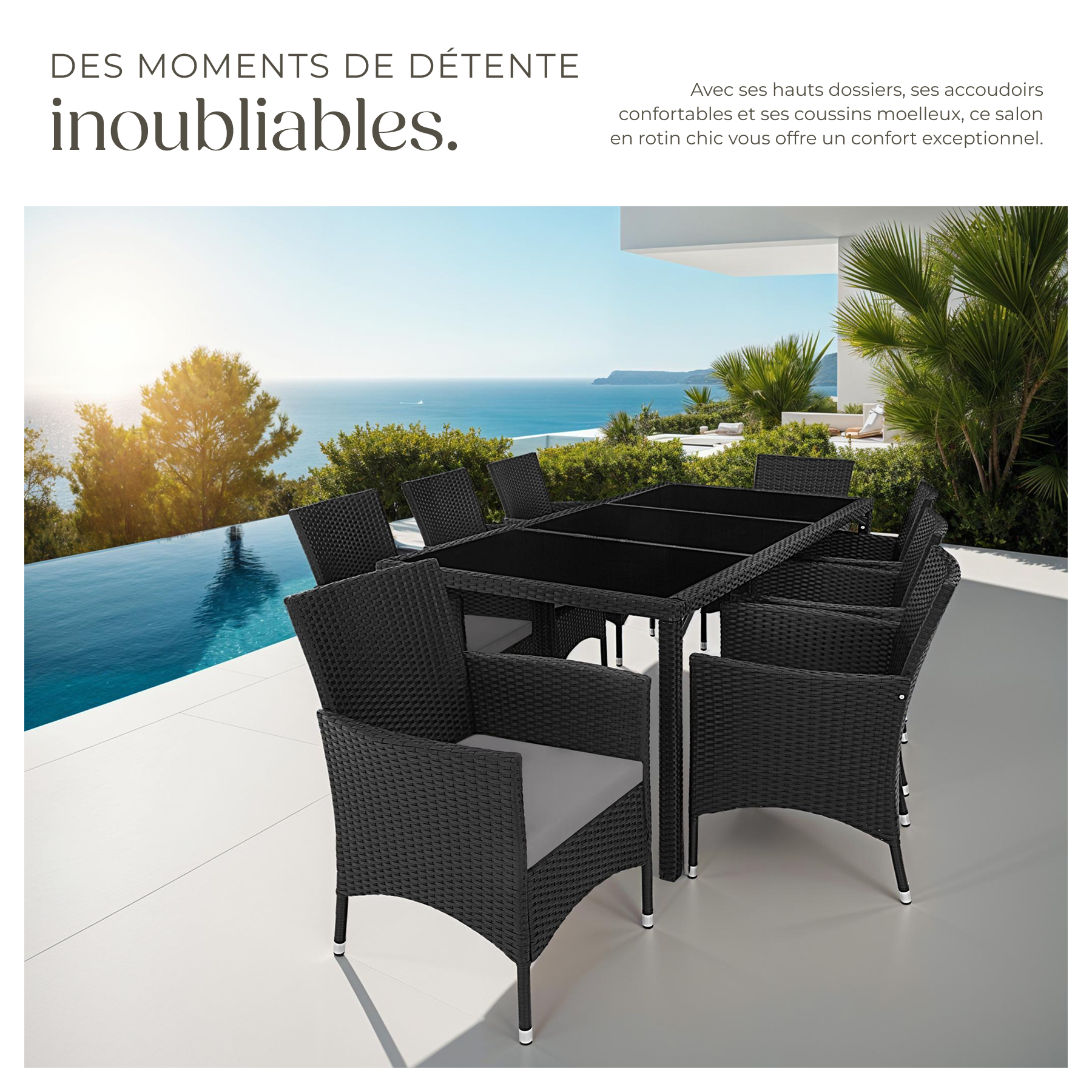 Pourquoi partir en vacances quand on peut recréer une ambiance relaxante et luxueuse dans son propre jardin ? Avec son design moderne et ses matériaux résistants, le salon de jardin VALENCIA transforme chaque dîner en plein air en une expérience inoubliable. Que vous organisiez un dîner en famille ou un apéritif entre amis, cet ensemble de jardin est votre allié pour des soirées réussies.