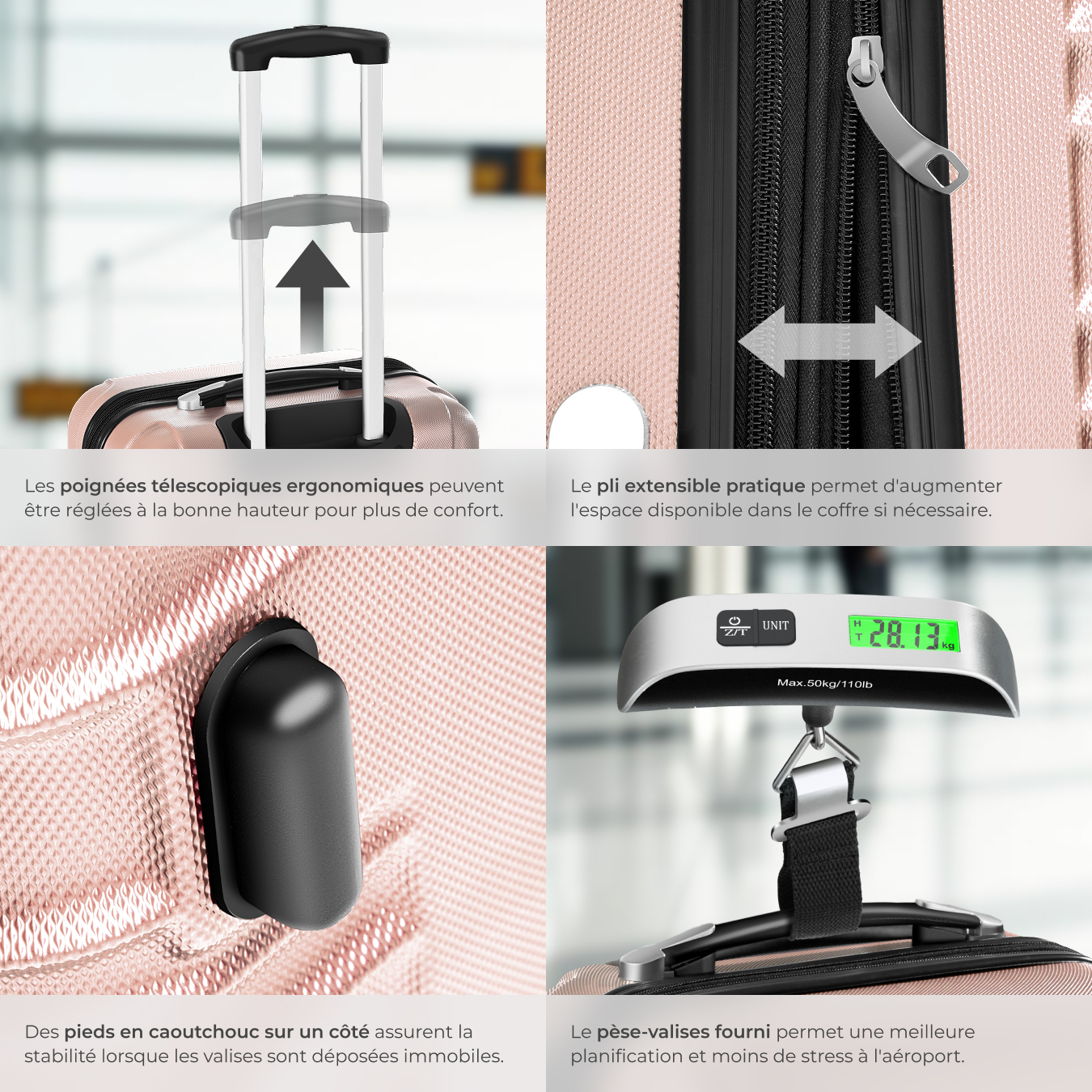 | Libellé | TECTAKE Set de valises rigides 4 pièces en plastique ABS robuste, pèse-bagages et une étiquette de valise incluses or rose |