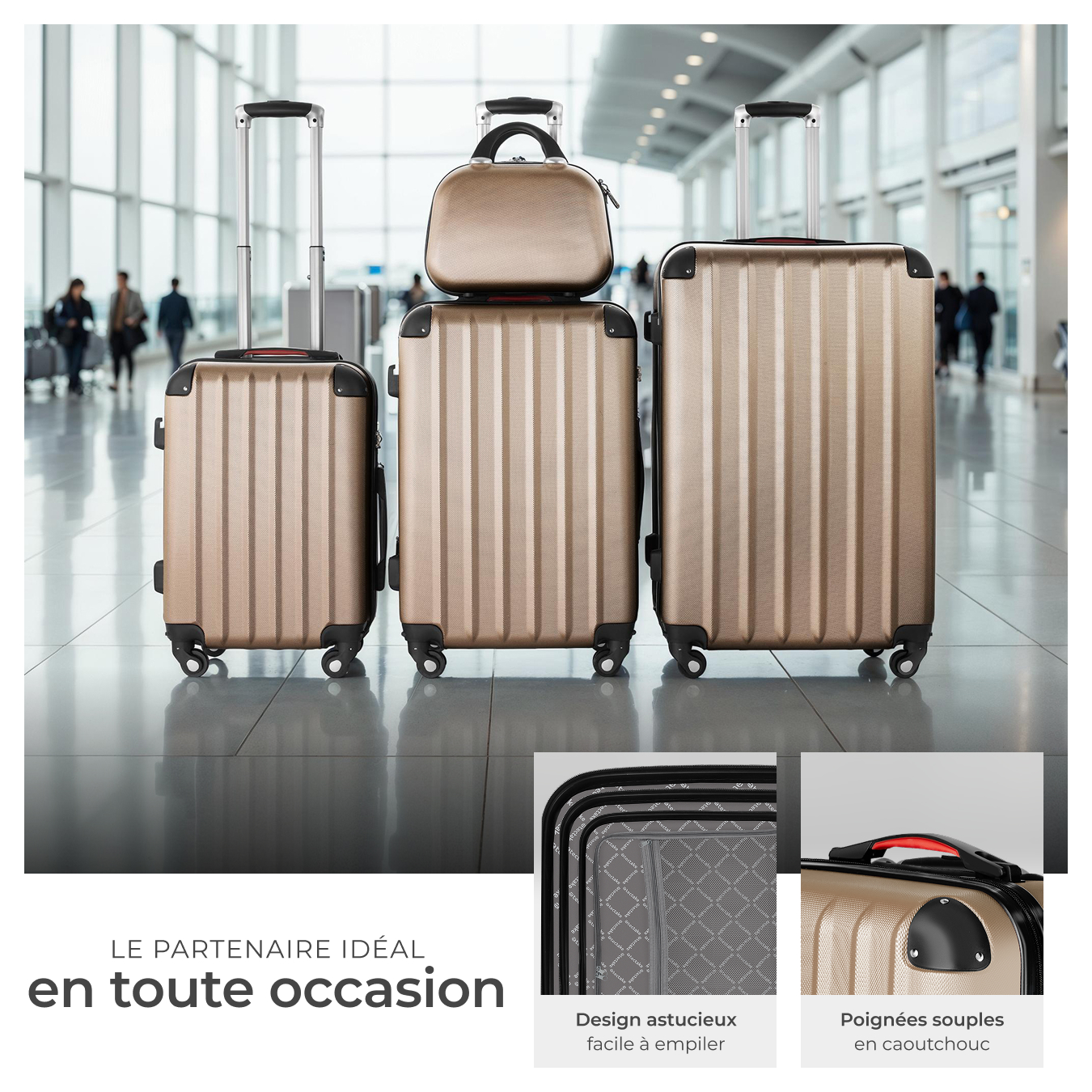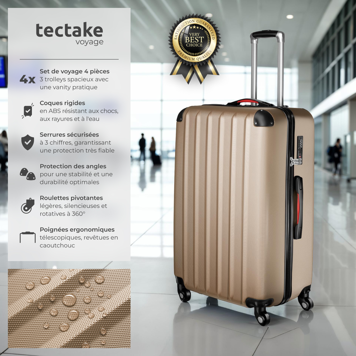 | Libellé | TECTAKE Set de valises trolley rigides 4 pièces, 3 trolleys et une trousse de beauté en plastique ABS robuste champagne |