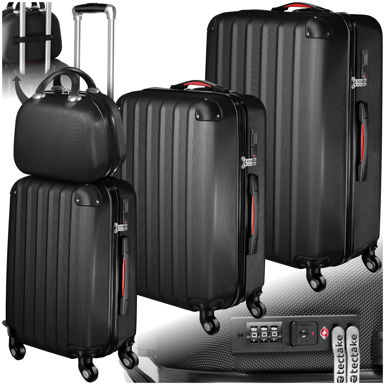 | Libellé | TECTAKE Set de valises trolley rigides 4 pièces, 3 trolleys et une trousse de beauté en plastique ABS robuste noir |