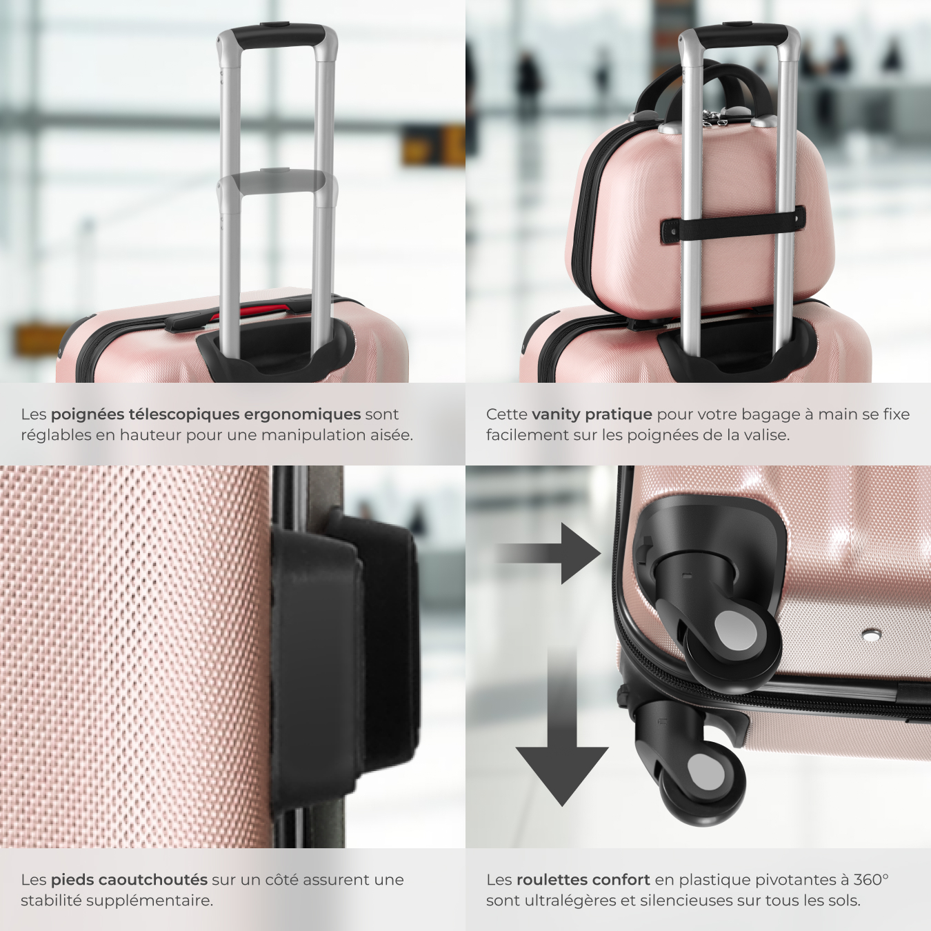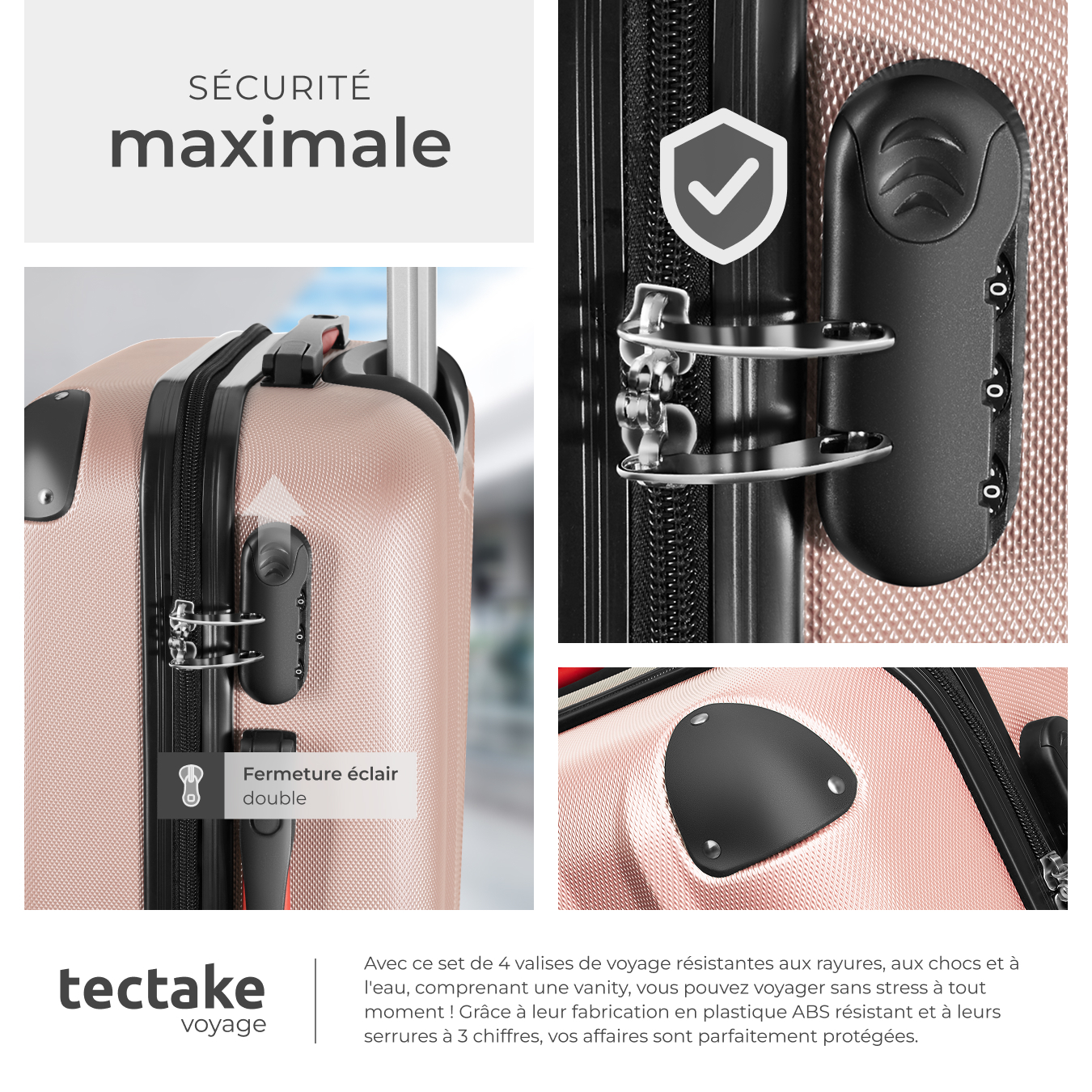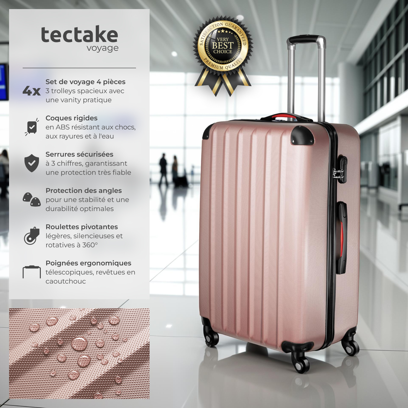 | Libellé | TECTAKE Set de valises trolley rigides 4 pièces, 3 trolleys et une trousse de beauté en plastique ABS robuste or rose |