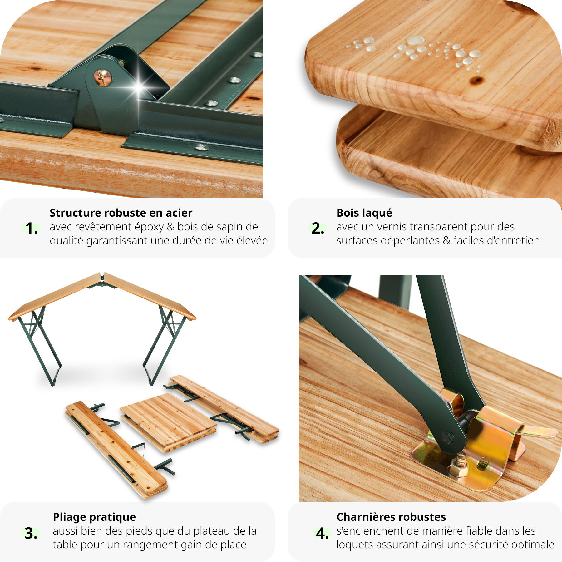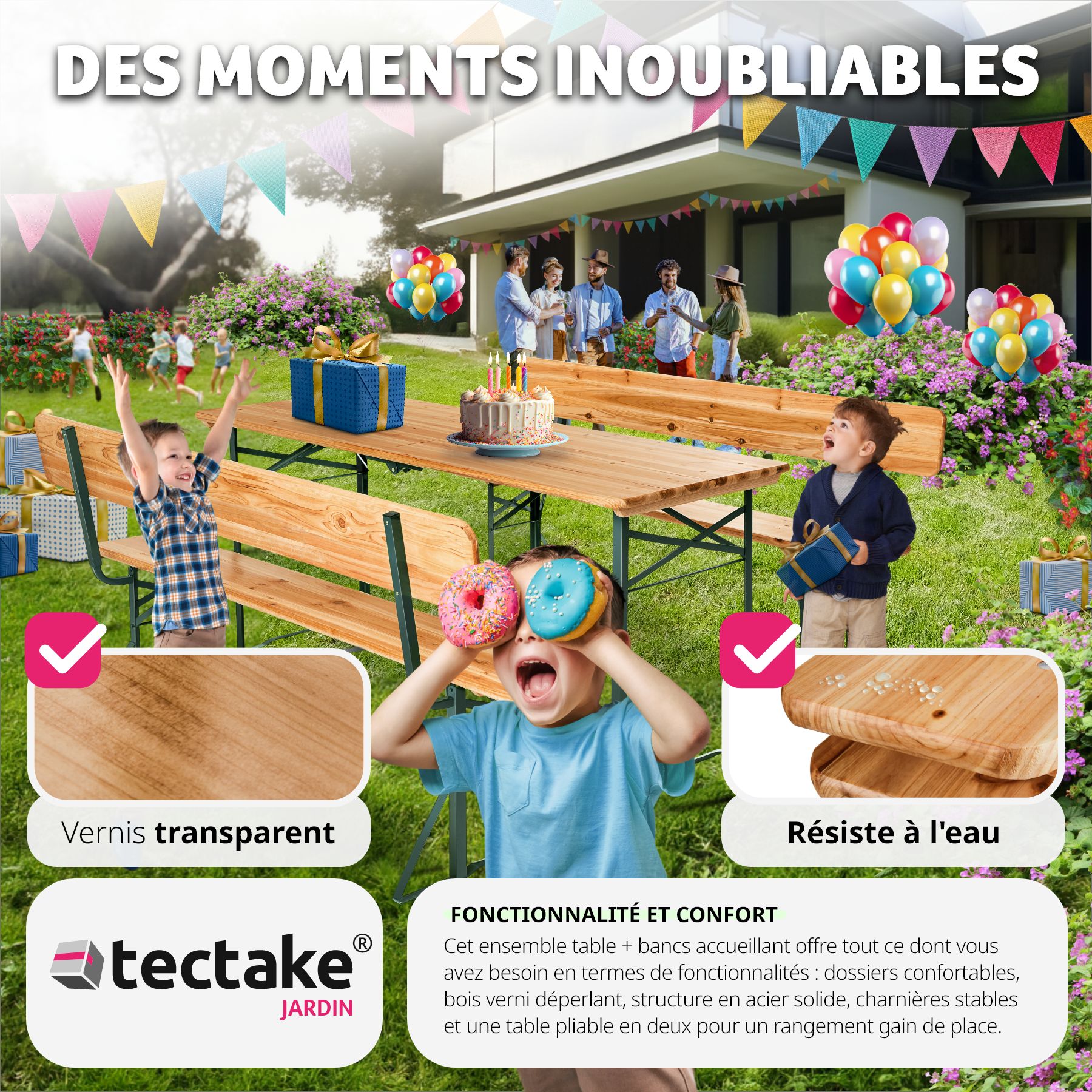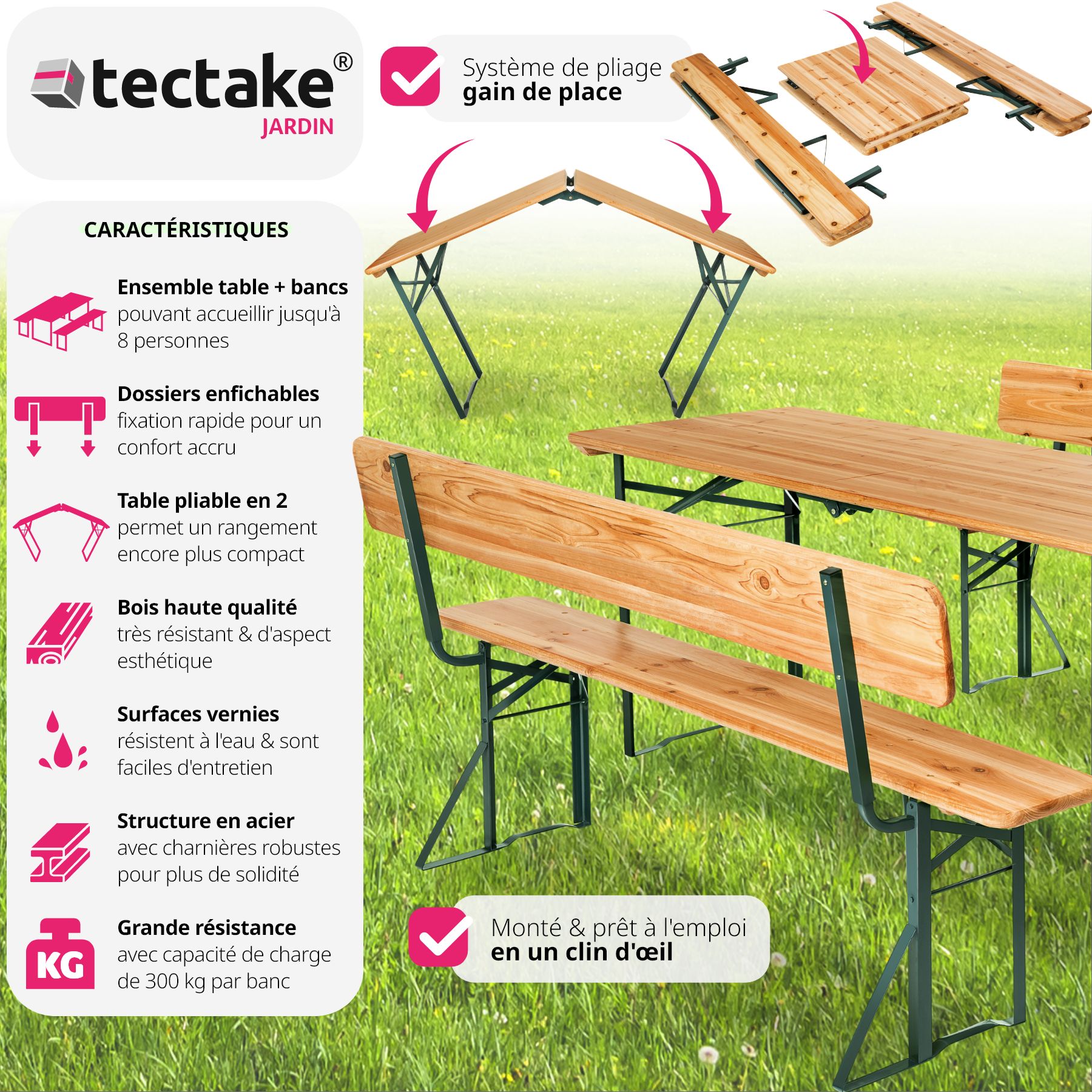 1 Table et 2 Bancs, Table de Jardin, Table de Réception, Table de Camping Pliable en Bois 176 cm x 69 cm x 76 cm Marron TECTAKE. Qu'il s'agisse d'anniversaires, de fêtes d'associations ou d'autres événements, l'ensemble robuste pour chapiteau invite dans tous les cas à se rassembler pour un moment agréable. Passez des soirées conviviales avec votre famille, vos amis sur ces bancs avec dossiers confortables. L'aspect naturel de ces bancs et cette table et leur style élégant vont vous séduire. Les bancs et la table de pique nique sont fabriqués en bois robuste.