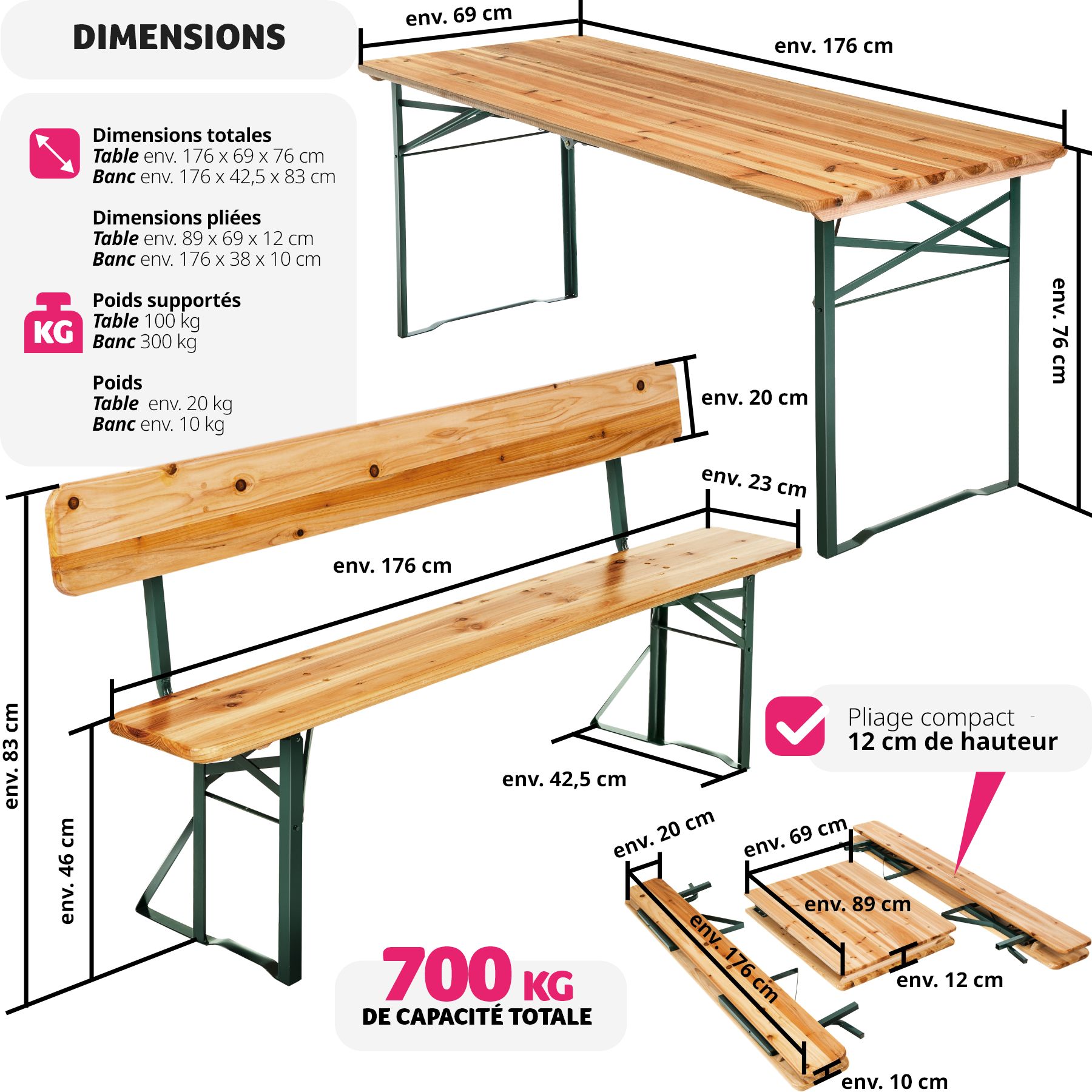 - Dimensions du banc plié (LxlxH) : environ 176 cm x 38 cm x 10 cm.