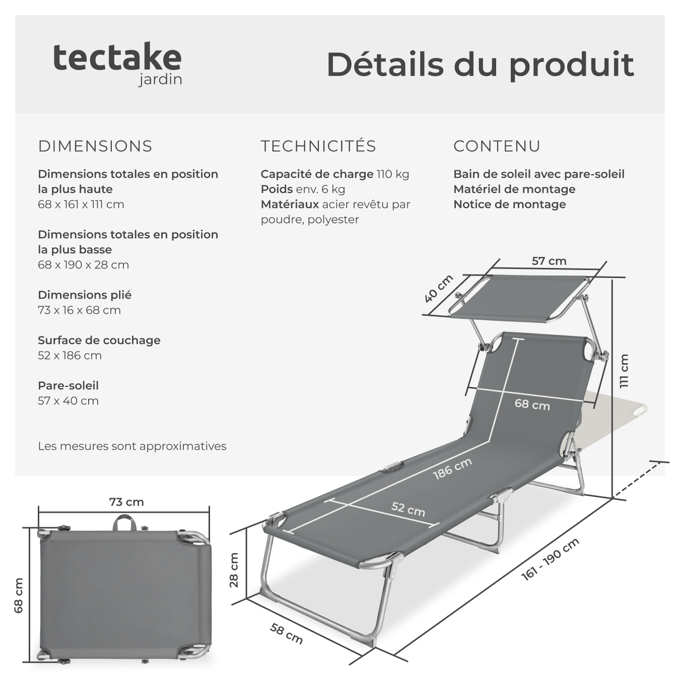 Chaise longue de jardin, Transat, Bain de soleil, Pare Soleil, Multi positions, Pliable 190 cm TECTAKE X 1. Chaise longue en acier de haute qualité avec pare-soleil intégré. Idéal pour le bain de soleil dans votre jardin ou sur la plage dans un confort assuré. Ce transat, facilement transportable est le compagnon idéal pour se détendre, se reposer et profiter de vacances bien méritées sous le soleil.