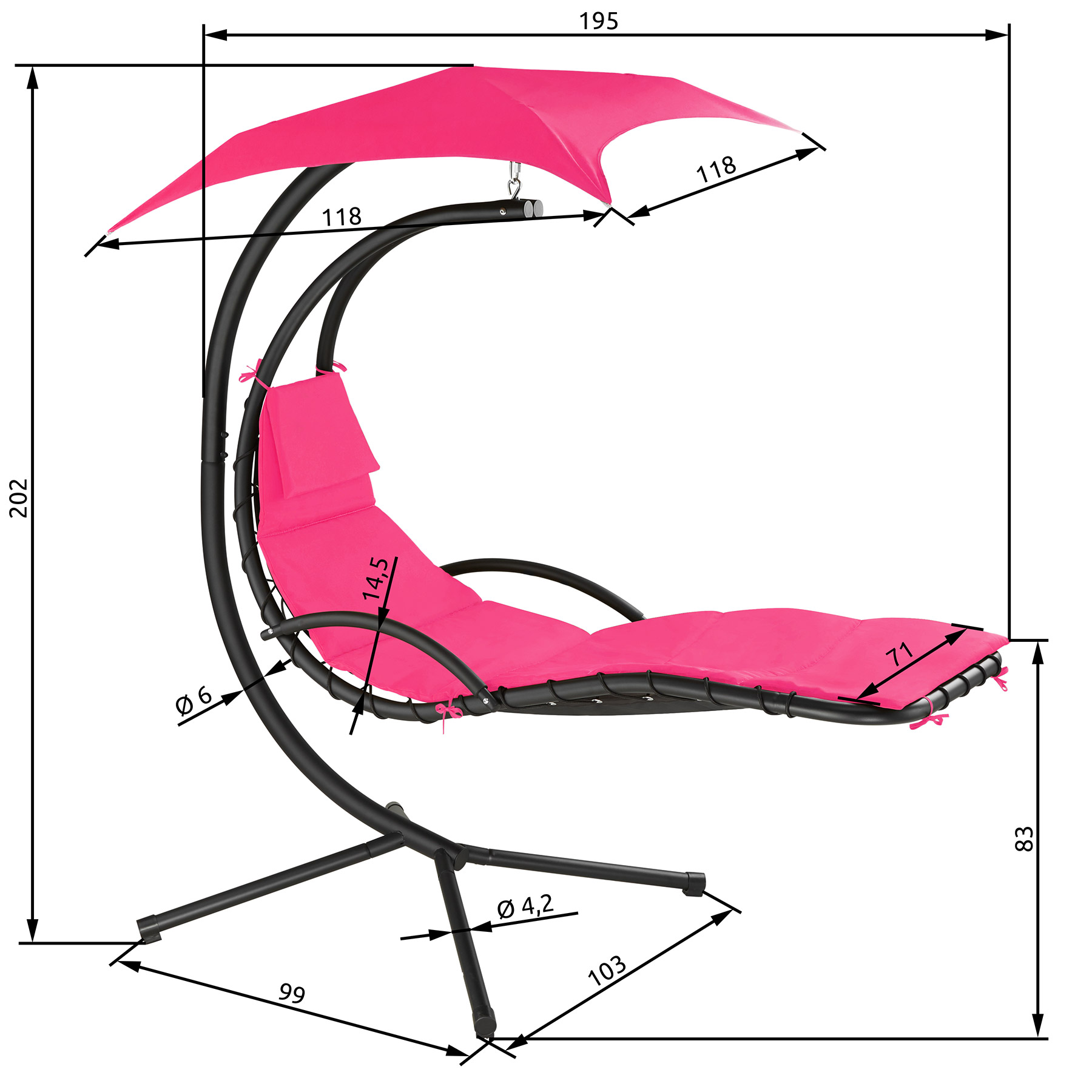 - Diamètre des tubes en acier de la chaise longue : environ 4,2 cm