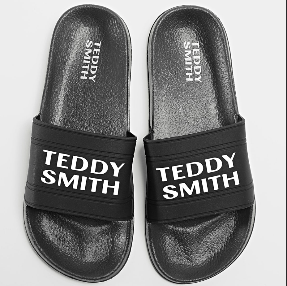 Claquettes Teddy Smith pour homme, modèle simple avec large logo blanc sur le dessus.