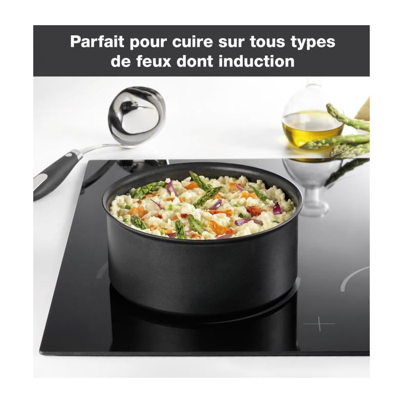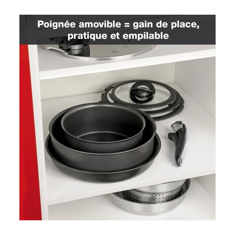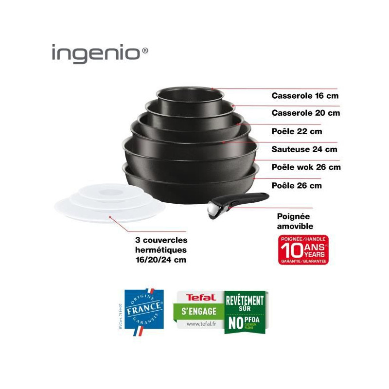 Avec Ingenio de Tefal, cuisinez de la plaque au four puis servez directement a table et conservez les restes dans votre réfrigérateur. Performance, une gamme parfaitement empilable, compatible tous feux dont induction avec un revetement antiadhésif durable Titanium Pro, sans PFOA, sans plomb, sans cadmium*. Poeles 22/26, casseroles 16/20 cm, poele wok 26 cm, sauteuse 24 cm, couvercles hermétiques 16/20/24 cm + 1 poignée classic - Matériau: Aluminium - Coloris: noir Revetement Titanium pro antiadhésif