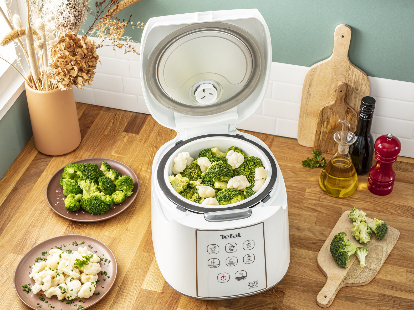Tefal RK7321. Couleur du produit: Blanc, Capacité du bol: 5 L, Durée de fonction de maintien au chaud: 12 h. Puissance: 750 W. Largeur: 265 mm, Profondeur: 340 mm, Hauteur: 240 mm. Largeur du colis: 322 mm, Profondeur du colis: 405 mm, Hauteur du colis: 276 mm. Couleur de panneau de commande: Blanc, Pays d'origine: Chine