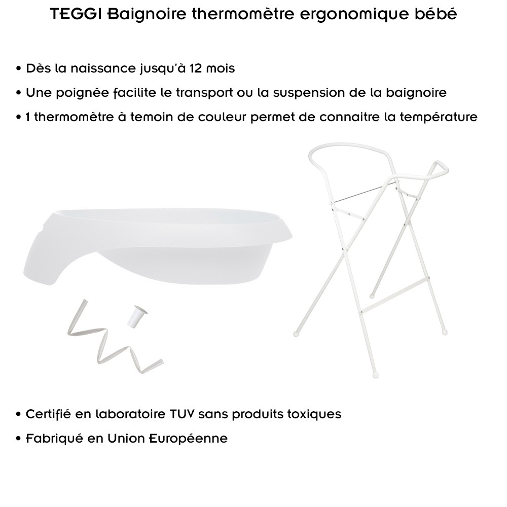 | Libellé | TEGGI Baignoire ergonomique bébé avec thermomètre Blanc + Pied + Tuyau |