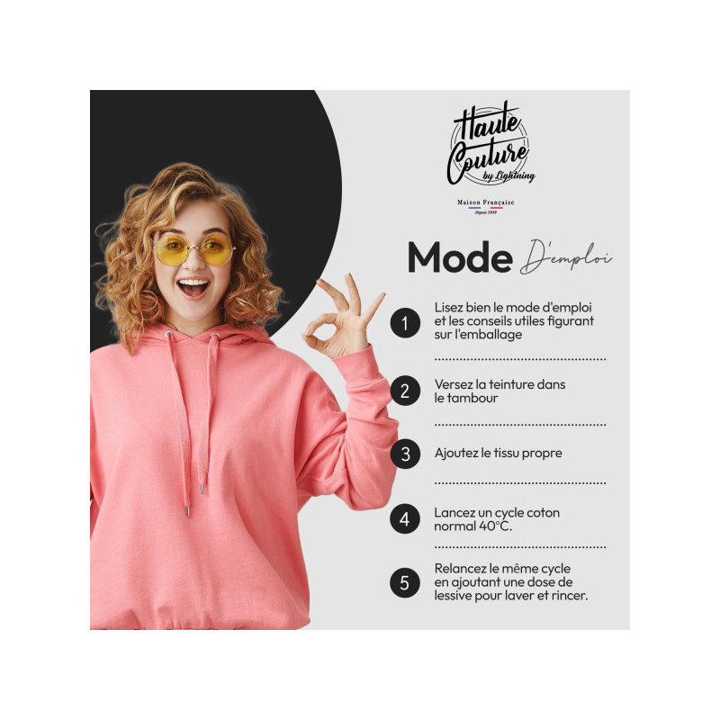Fabriquée en France, la teinture Haute Couture incarne le luxe et l'excellence à la française. Elle est numéro 1 des ventes en France dans les pressings, blanchisseries et teintureries spécialisées. Inspirée par les défilés de mode et les tendances du design d'intérieur, cette teinture offre une qualité sans compromis.