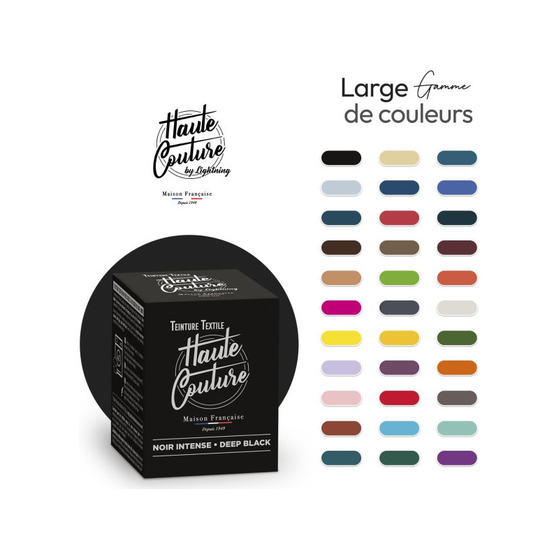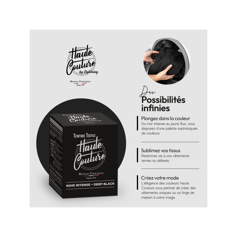Découvrez la teinture textile Haute Couture couleur Noir, idéale pour transformer vos vêtements, textiles et linge de maison. Cette teinture offre un résultat riche et durable qui ajoute élégance et caractère à vos projets.