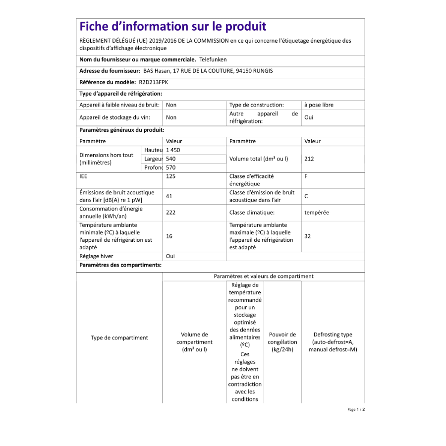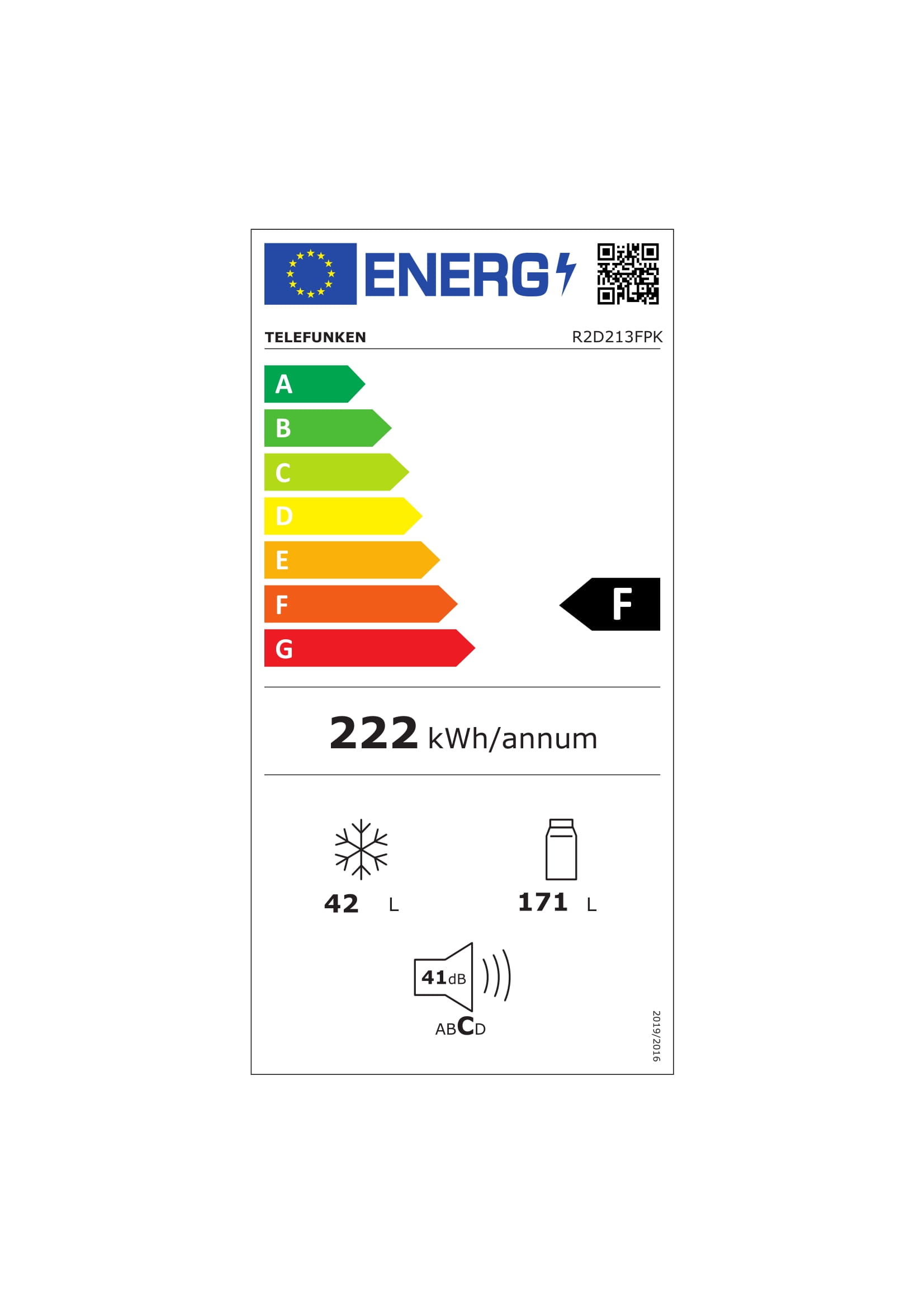 Telefunken R2D213FPK. Capacité nette totale: 212 L. Emplacement charnière de porte: Gauche. Niveau sonore: 41 dB. Capacité nette du réfrigérateur: 170,5 L, Nombre de clayettes/bacs du réfrigérateur: 5, Nombre de tiroirs à légumes: 1. Capacité net du congélateur: 41,5 L, Capacité de congélation: 2,6 kg/24h. Nouvelle zone compartiment. Classe d'efficacité énergétique: F, Consommation annuelle d'énergie: 222 kWh. Couleur du produit: Noir