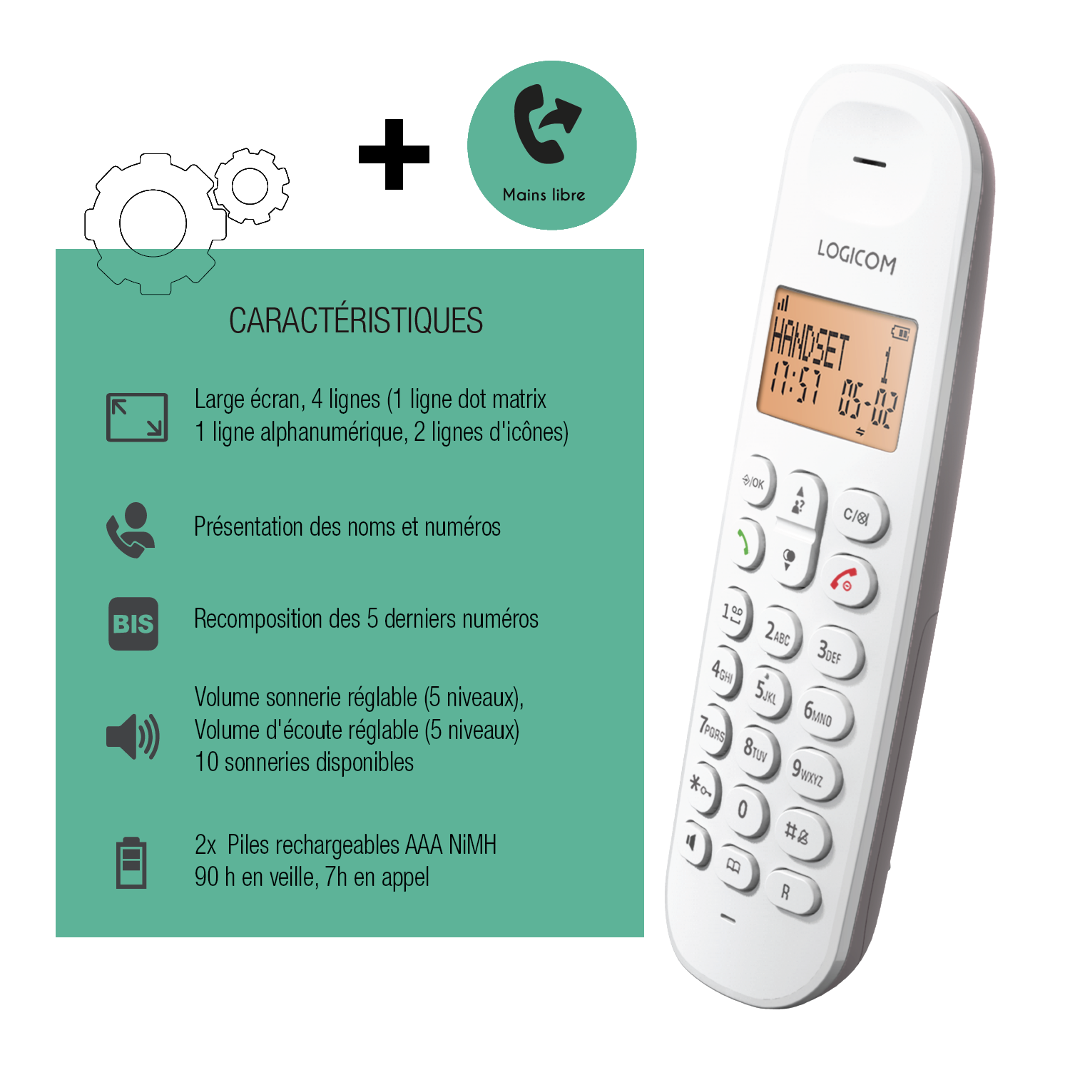 TÉLÉPHONEZ EN TOUTE LIBERTÉ Le téléphone sans fil Iloa 150 vous apportera tout le confort dont vous avez besoin. Alliant design, modernité et fiabilité, il sera votre meilleur atout pour téléphoner en tout tranquillité chez vous. iL est compatible avec votre box internet, la technologie DECT/GAP et dispose même d'un mode économie d'énergie. Il offre la possibilité de recomposer automatiquement les cinq derniers numéros composés et possède une sonnerie ajustable sur cinq niveaux. Vous pouvez également régler le volume d'écoute selon vos préférences, avec cinq niveaux de réglage pour un confort optimal. Enfin, avec un choix de dix sonneries différentes, vous pouvez personnaliser l'ambiance sonore de votre téléphone pour refléter votre style unique. UNE GRANDE FLEXIBILITE Sa batterie performante vous offre jusqu'à 90 heures en veille et 7 heures en appel, vous garantissant une utilisation fiable tout au long de la journée. Ce téléphone est conçu pour répondre à vos besoins de communication tout en offrant une grande flexibilité et une autonomie exceptionnelle. De plus, il facilite la communication au sein de votre foyer ou de votre bureau grâce à sa capacité d'interphone entre combinés, vous permettant d'échanger des messages rapidement et simplement. Vous pouvez également organiser des conférences à trois personnes, avec la possibilité de connecter jusqu'à cinq combinés maximum pour une collaboration optimale. Avec cette nouvelle gamme, la fonction haut-parleur est également disponible.