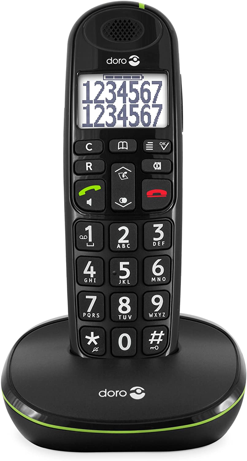Ce téléphone DECT sans fil a une couverture maximale de 300 mètres et une couverture intérieure jusqu'à 50 mètres. La couverture du téléphone varie en fonction des obstacles (murs ou autres) que les ondes radio peuvent rencontrer sur leur chemin. Le dispositif émettra un avertissement sonore lorsque l'appareil sortira de la zone de couverture.Activez le mode haut-parleur lorsque vous êtes en train de faire autre chose pendant l’appel.Avec le téléphone fixe Doro PhoneEasy 110, vous pouvez parler jusqu'à 10 heures avec une charge complète ou le laisser en mode veille jusqu'à 100 heures. Lorsque la batterie est faible, le voyant LED clignote et vous entendrez un signal sonore pendant l'appel.Grâce aux touches larges et clairement visibles et à l'écran rétroéclairé, il sera vraiment facile de composer un numéro rapidement et correctement en évitant les erreurs dues à un clavier trop petit. Ce téléphone sans fil est particulièrement adapté aux personnes âgées et aux personnes ayant des problèmes d'audition et de vue.Le téléphone sans fil inclus dans le coffret est déjà connecté à la base. Il est possible d'associer jusqu'à 5 appareils pour chaque base. Ce modèle est compatible avec GAP (Generic Access Profil), de sorte que le combiné et la base puissent être utilisés avec la plupart des appareils, quel que soit le fabricant.Il est possible d'activer la tonalité du clavier de façon que chaque fois que vous appuyez sur une touche, le numéro appuyé soit prononcé. Cette fonctionnalité s'avère très utile en particulier pour les personnes malvoyantes.Ce téléphone sans fil est compatible avec les appareils auditifs afin que vous obteniez un son fort et clair même en les portant.Le bouton Boost vous permettra d'augmenter le son jusqu'à + 10dB. Appuyez sur le bouton sur le côté du combiné pour activer / désactiver l'amplificateur. Lorsqu'il est activé, le voyant LED s'allume. L'amplification est désactivée à la fin de chaque appel.Utilisez les touches 2 à 9 pour appeler vos contacts favoris d'un simple toucher. Appuyez et maintenez enfoncé sur la touche correspondant au contact que vous avez configuré pour démarrer l'appel.