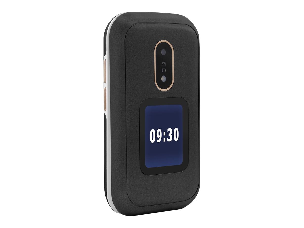 Téléphone portable à clapet 2G facile à utiliser avec une grande lisibilité, un affichage externe, de larges touches espacées, un son clair et puissant compatible appareils auditifs, un appareil photo, des touches d’accès direct, une touche d’assistance avec géolocalisation en cas d’urgence et un socle de charge fourni.